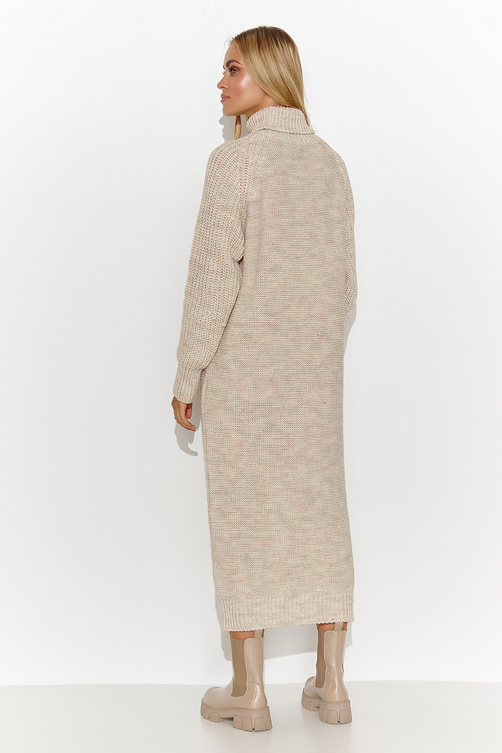 Ta swetrowa sukienka za kolano to połączenie wygody i klasy w jednym. Długi swobodny rękaw oraz golf zapewniają przytulne ciepło, idealne na chłodniejsze dni. Wydłużony fason za kolano nadaje sukience elegancji, a jednocześnie pozwala na swobodne noszenie jej zarówno na co dzień, jak i do pracy. Efektowny splot w kształcie warkocza, umieszczony po środku z przodu, dodaje sukience unikatowego charakteru i podkreśla jej wyjątkowy design. Z kolei gładka tylna część sukienki sprawia, że zachowany jest balans. Sukienka dostępna jest w urokliwych kolorach: cappuccino, beżowym, śmietankowym, czarnym i czekoladowym. Zestaw ją z kozakami, aby stworzyć modny i wygodny look na jesień i zimę. Możesz też założyć do niej sneakersy na bardziej casualowe wyjścia. Jej wszechstronność sprawia, że jest idealnym wyborem dla aktywnych kobiet, które cenią sobie modny i komfortowy look.
