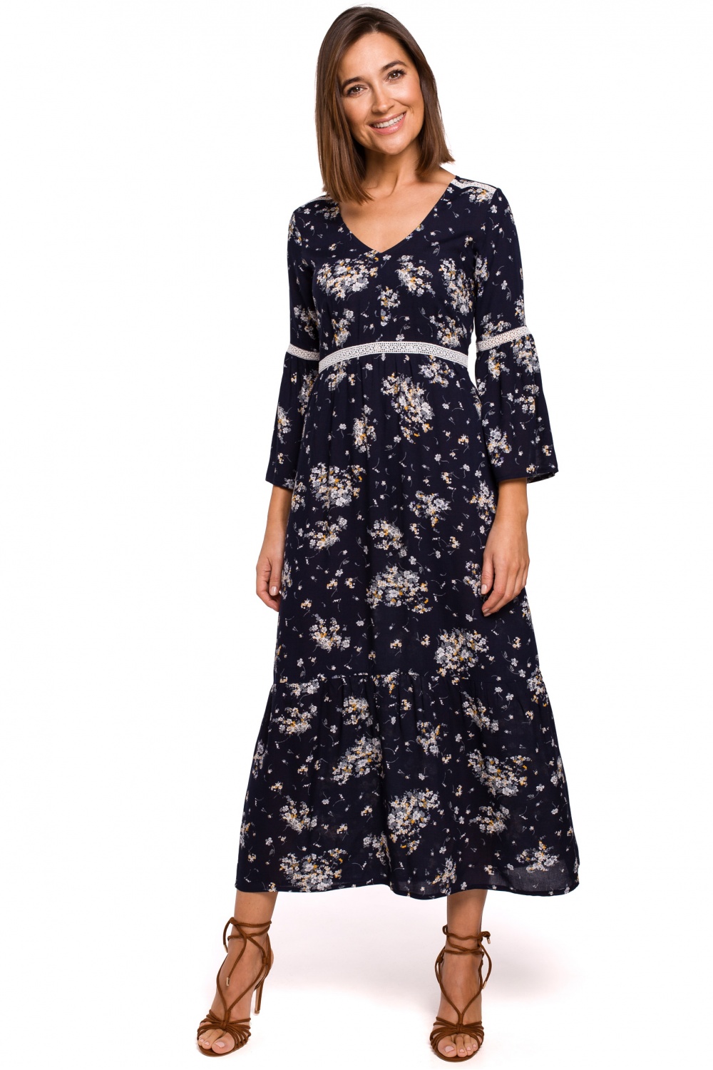 Romantyczna z elementami boho sukienka maxi ze wstawkami z koronki przy rękawach i na ramionach oraz z lekko rozkloszowaną spódnicą z falbaną. Sukienka bez podszewki.
