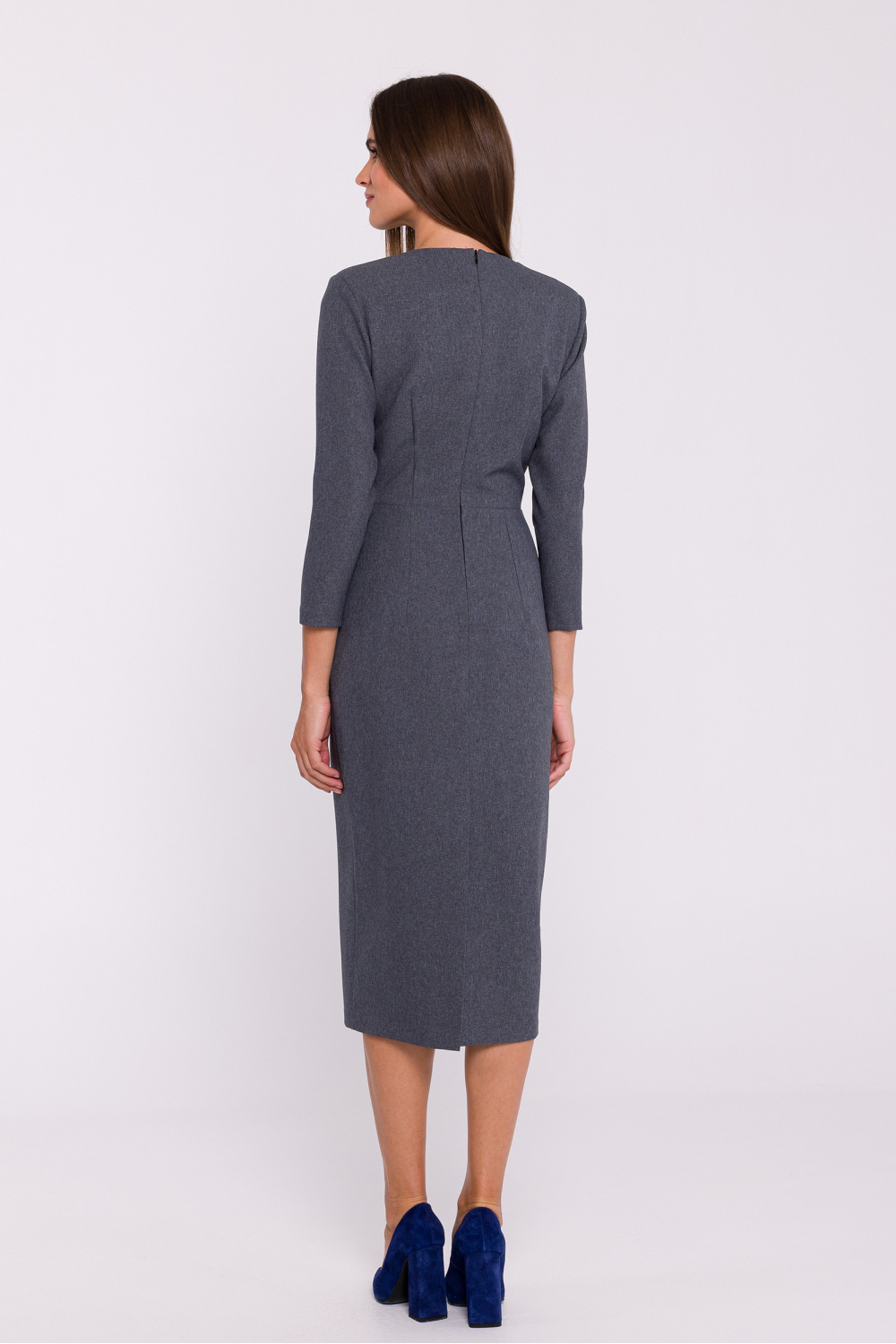 Elegancka sukienka z tkaniny o prostym, ołówkowym fasonie, odcinana w pasie, która subtelnie podkreśla sylwetkę. Dekolt w kształcie litery V dodaje szyku i wysmukla optycznie linię szyi. Długość midi zapewnia klasyczny wygląd, idealny zarówno na formalne, jak i codzienne okazje. Sukienka jest wyposażona w kryty zamek z boku oraz podszewkę, co zapewnia komfort i perfekcyjne dopasowanie. Dodatkowym, ozdobnym akcentem jest dopinany kwiatek na piersi, który dodaje jej oryginalności. Zaprojektowana i uszyta w Polsce, stanowi doskonały wybór dla kobiet ceniących styl i elegancję.