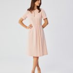 Elegancka sukienka uszyta z gładkiej tkaniny o miękkim wykończeniu, która pięknie układa się na sylwetce. Klasyczny, zaokrąglony dekolt oraz długie rękawy nadają jej ponadczasowy charakter. Dopasowana góra subtelnie podkreśla talię, zaakcentowaną dodatkowymi patkami z ozdobnymi złotymi guzikami. Dół w kształcie delikatnej litery A lekko rozszerza się ku dołowi, tworząc trapezowy fason, który łączy elegancję z komfortem noszenia. Kryty zamek z tyłu zapewnia wygodę i estetyczne wykończenie, a długość przed kolano czyni tę sukienkę idealną zarówno na spotkania biznesowe, jak i bardziej formalne okazje. Zaprojektowano i uszyto w Polsce.