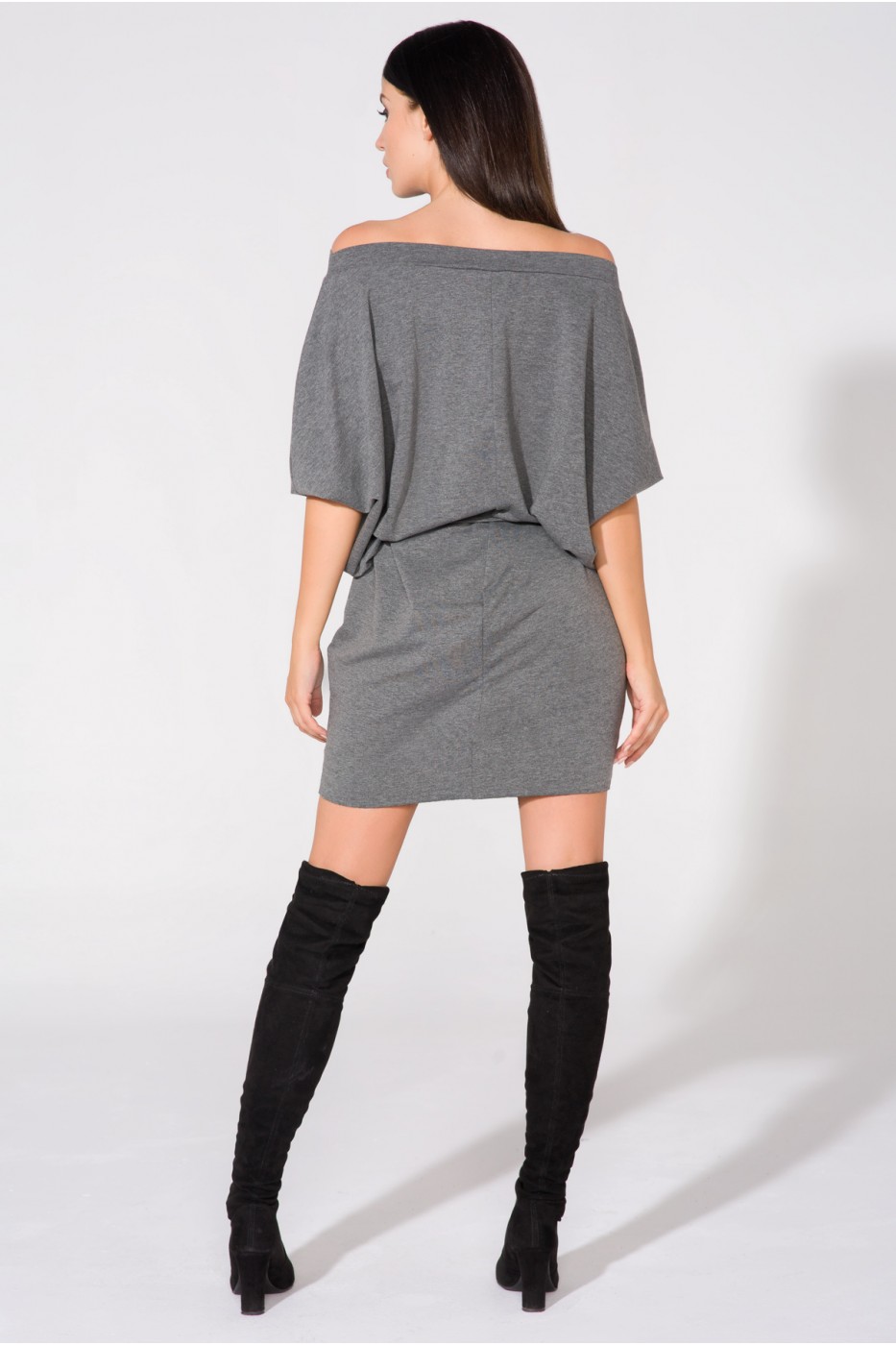 Luźna sukienka z dzianiny z dużymi kieszeniami na przodzie. Dekolt na łódkę wykończony ściągaczem.