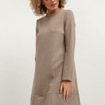 Elegancka sukienka mini o lekko trapezowym fasonie. Na tyle ozdobne oczko z przedłużaną lamówką. Przy rękawach ozdobne wiązanie. Dekolt łódka, rękawy długie. Sukienka idealna na co dzień do pracy, na garden party czy innego rodzaju rodzinne uroczystości.