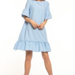 Sukienka midi wykonana z przytulnej bawełnianej dzianiny z dekoltem w łódkę i krótkim rękawem. Odcięta w talii, a dół lekko rozkloszowany dół. Nasza propozycja na każdy dzień.
