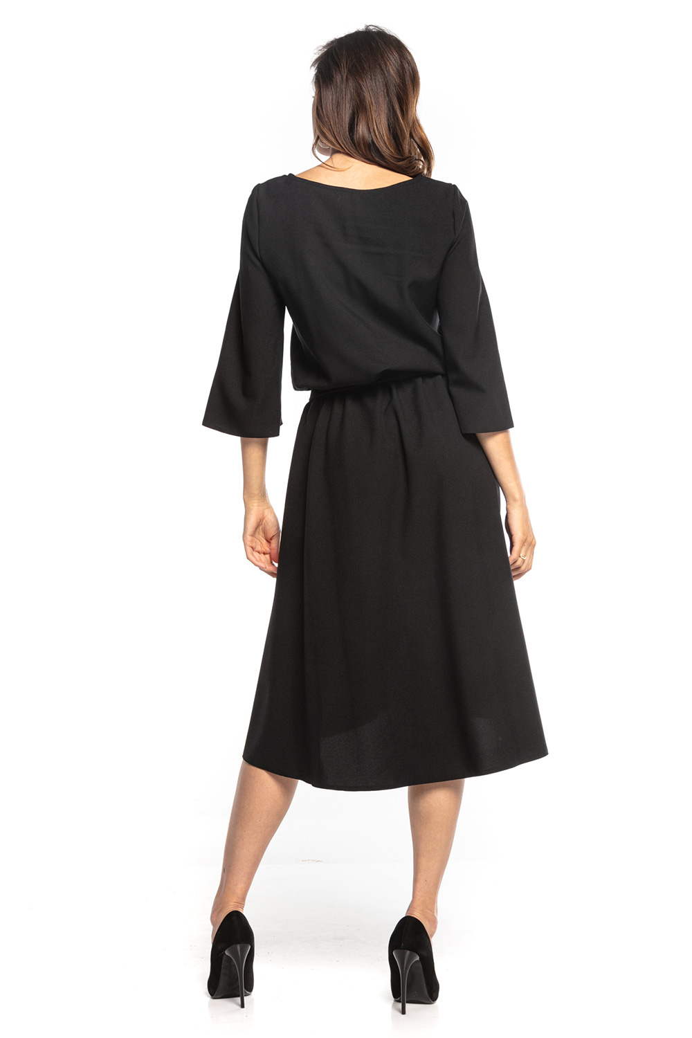 Elegancka asymetryczna sukienka midi z rękawem 3/4. Tył sukienki jest dłuższy, przód otwarty. Sukienka jest marszczona w talii gumką oraz dodatkowo pasek w kolorze sukienki do zawiązania.