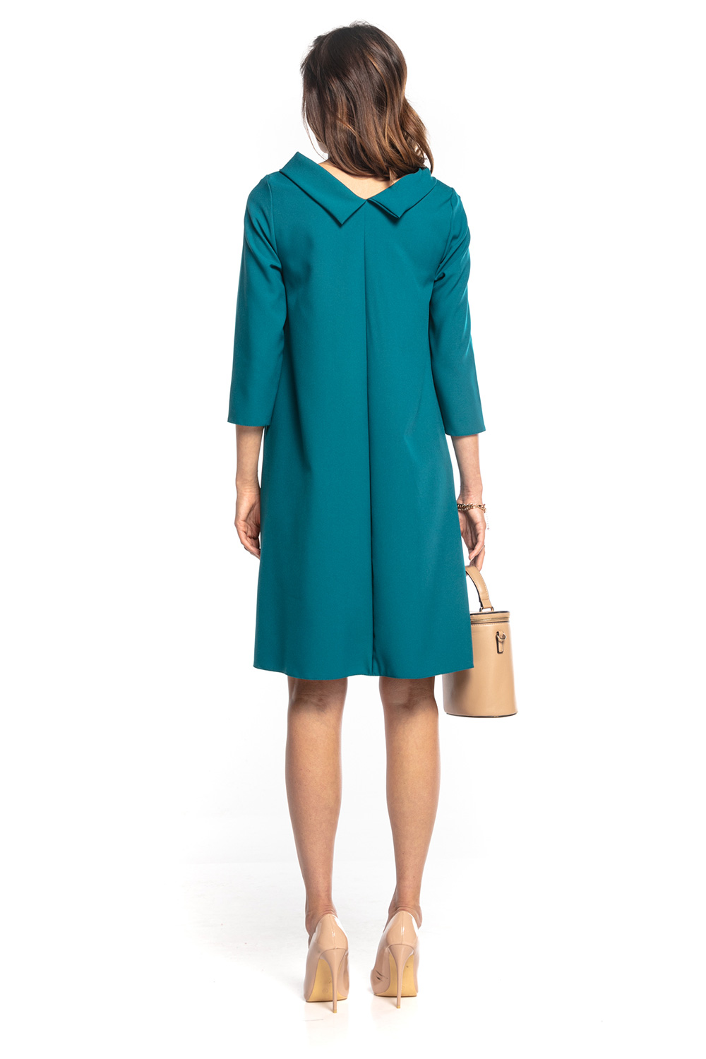 Elegancka trapezowa sukienka midi z rękawem 3/4 i podwiniętym kołnierzem w stylu Jackie Kennedy. Doskonale kryje niedoskonałości sylwetki.