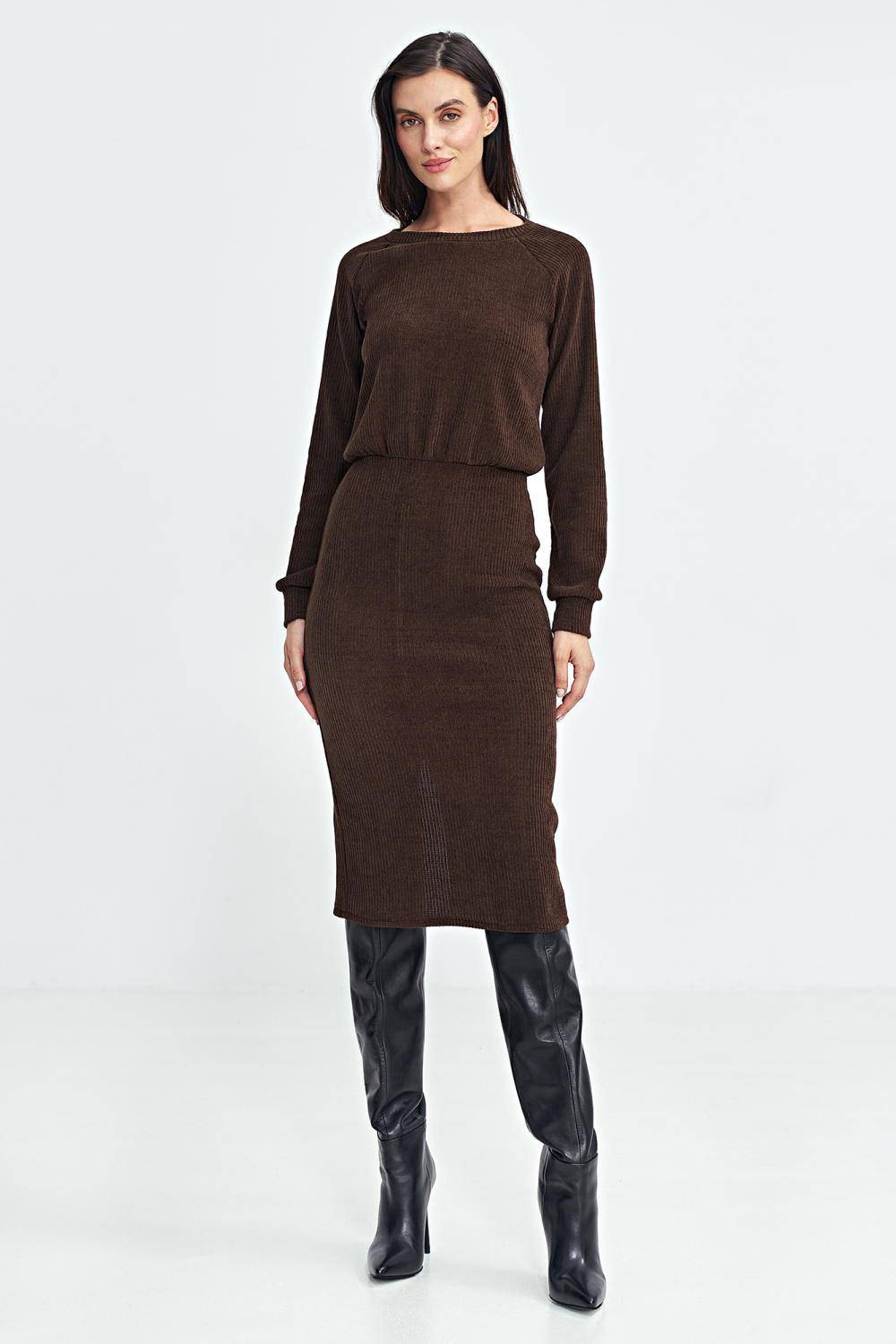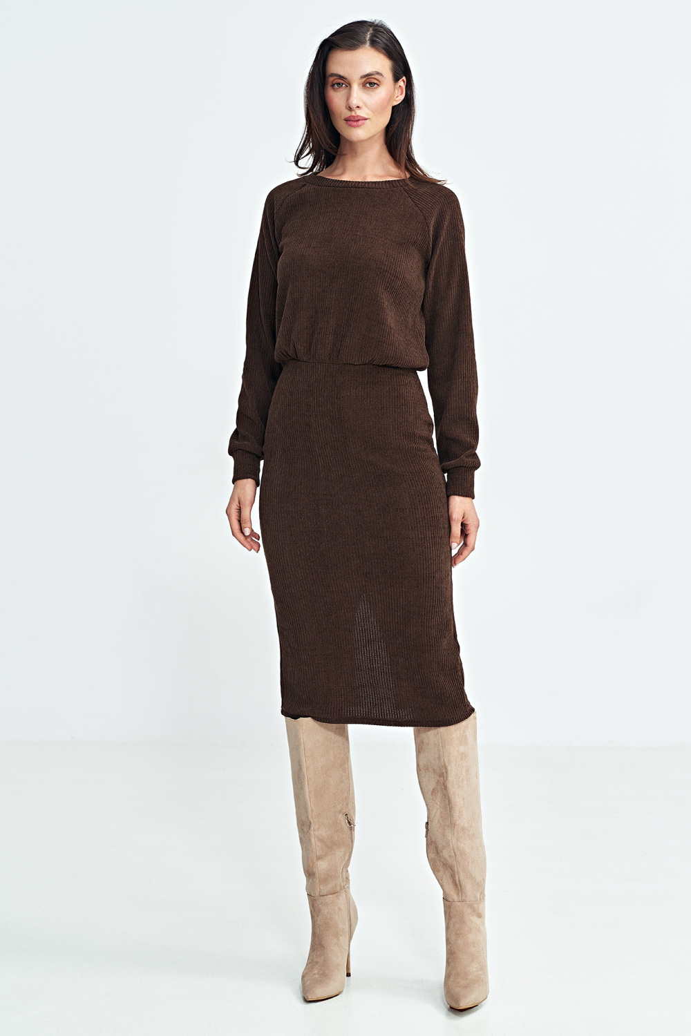 Sukienka z dzianiny prążkowanej z długim rękawem S260 Brown – Nife