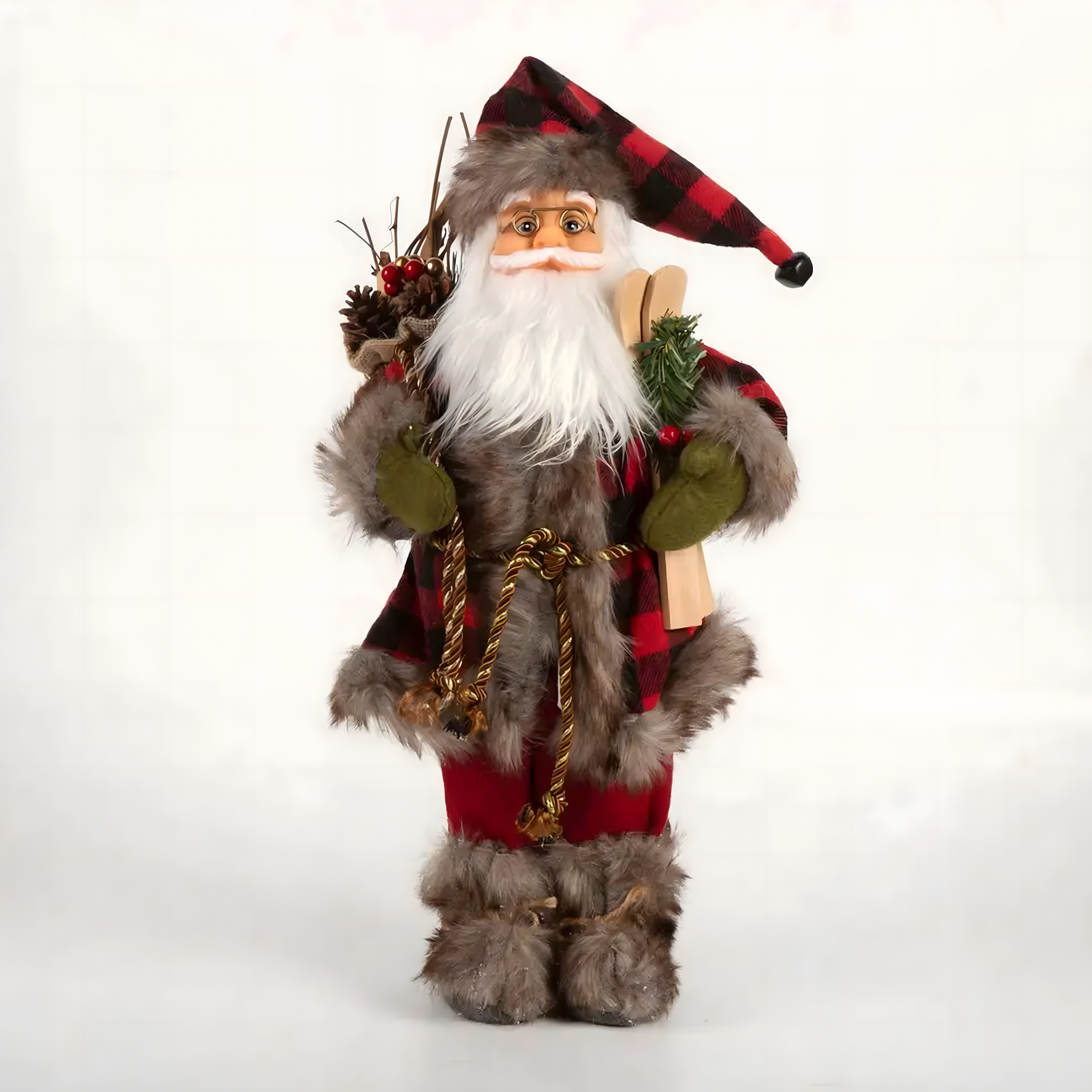 Figurka przestawia Świętego Mikołaja jako siwego staruszka w okularach, w klasycznej wersji z charakterystycznymi atrybutami: w czerwonym stroju, z długą siwą brodą, niosącego prezenty.