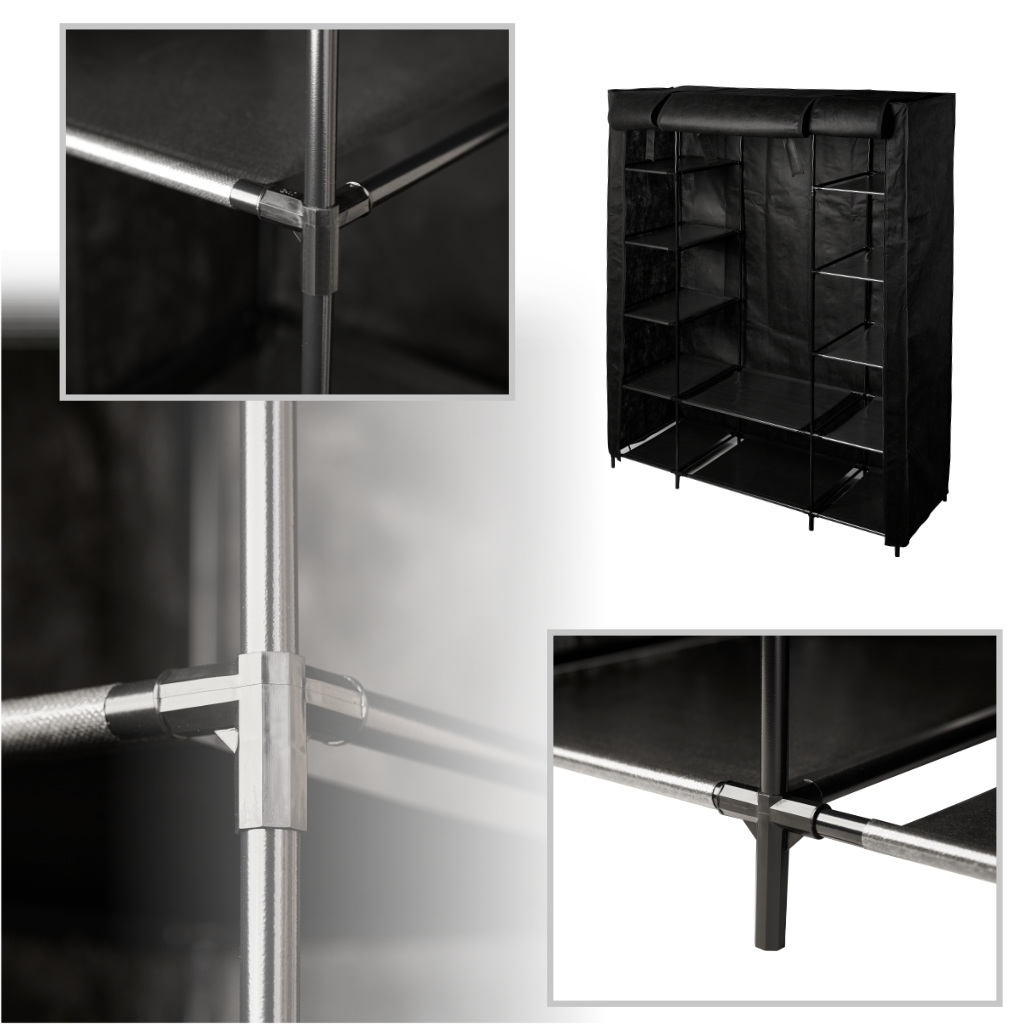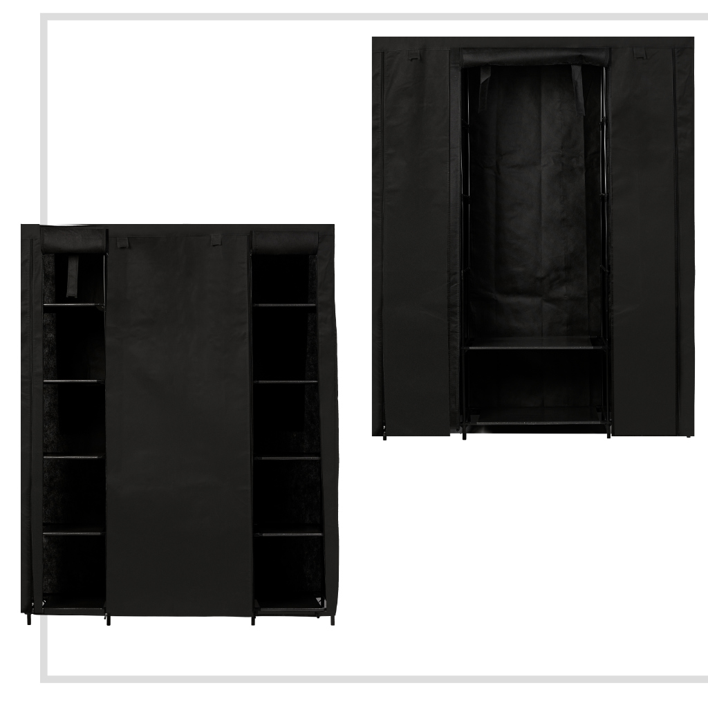 Szafa materiałowa – doskonale się z sprawdzi jako zastępstwo dużej i drogiej szafy. Czternaście półek oraz dwa drążki na wieszaki zapewnia dużą ilość miejsca na ubrania. Posiada metalowy stelaż. Kolor: czarny. Wymiary: 180 cm x 133 cm x 44 cm.