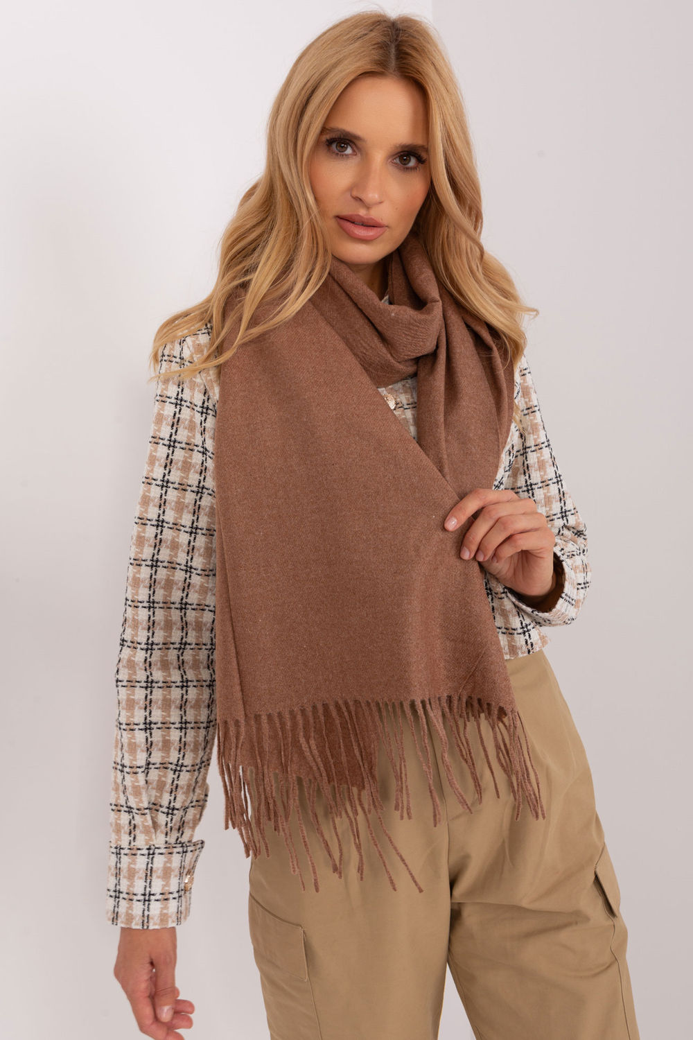 Ciepły długi szalik z ozdobnymi frędzlami, idealna propozycja na zimę.