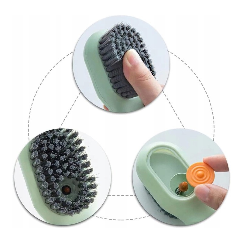 Szczotka do czyszczenia z aplikatorem na mydło, płyn.Szczotka tworzy bogatą piankę, która łatwo szoruje duże powierzchnie i skutecznie czyści brud.Włosie wykonane jest z nylonu i jest umiarkowanie miękkie, ściśle połączone z główką szczotki, trwałe.Środek czyszczący można przechowywać wewnątrz głowicy szczotki, automatycznie wypływa po zamknięciu pokrywy i naciśnięciu przycisku.Zaokrąglony, ergonomiczny kształt uchwytu umożliwia łatwe wywieranie nacisku podczas szorowania, wygodny uchwyt.Szczotka idealna do czyszczenia butów z różnych materiałów, takich jak skóra i tkanina.Może być również stosowana do odzieży, zapierania i głębokiego czyszczenia.Wymiary:Podane na zdjęciuMateriał:- Włosie syntetyczne- Tworzywo sztuczne