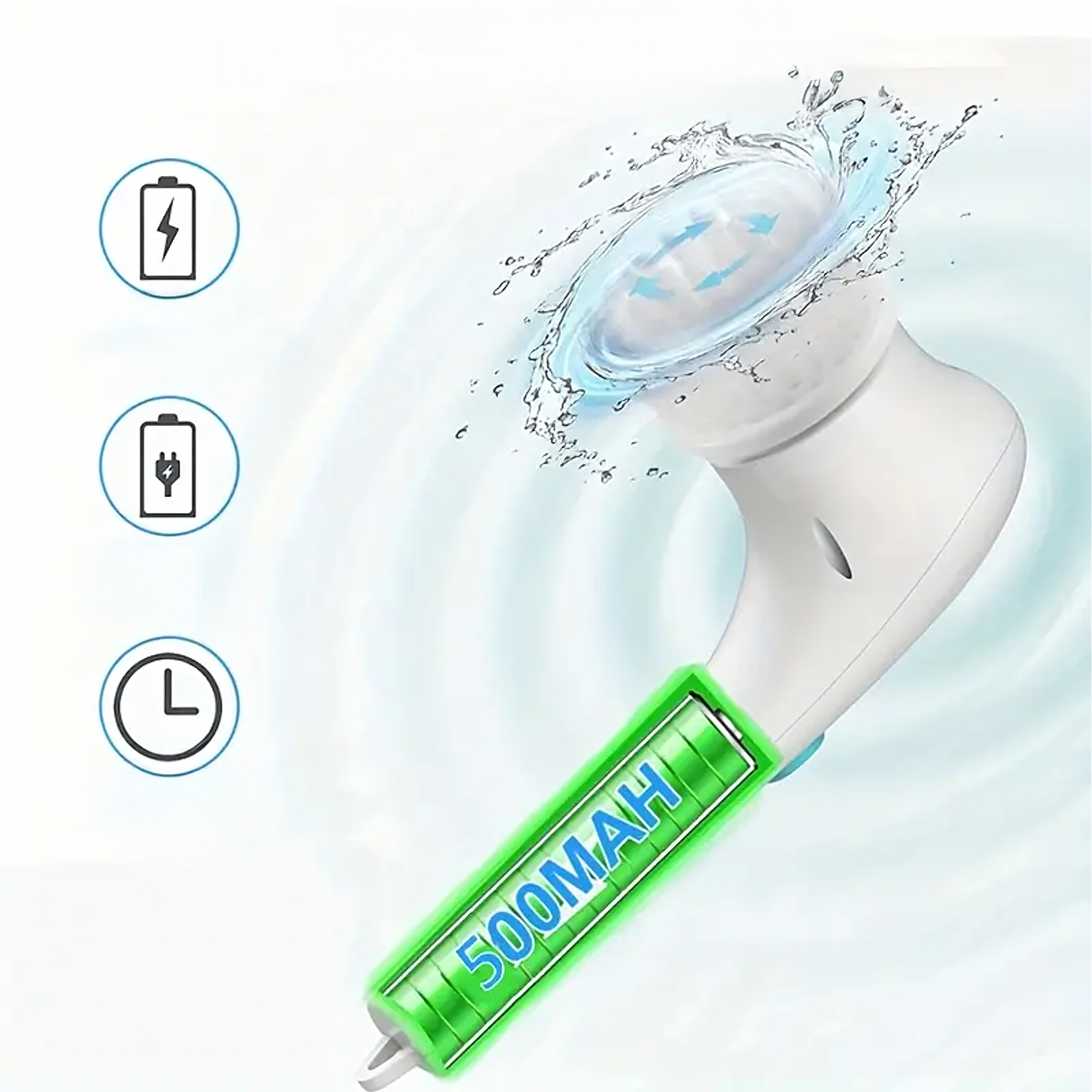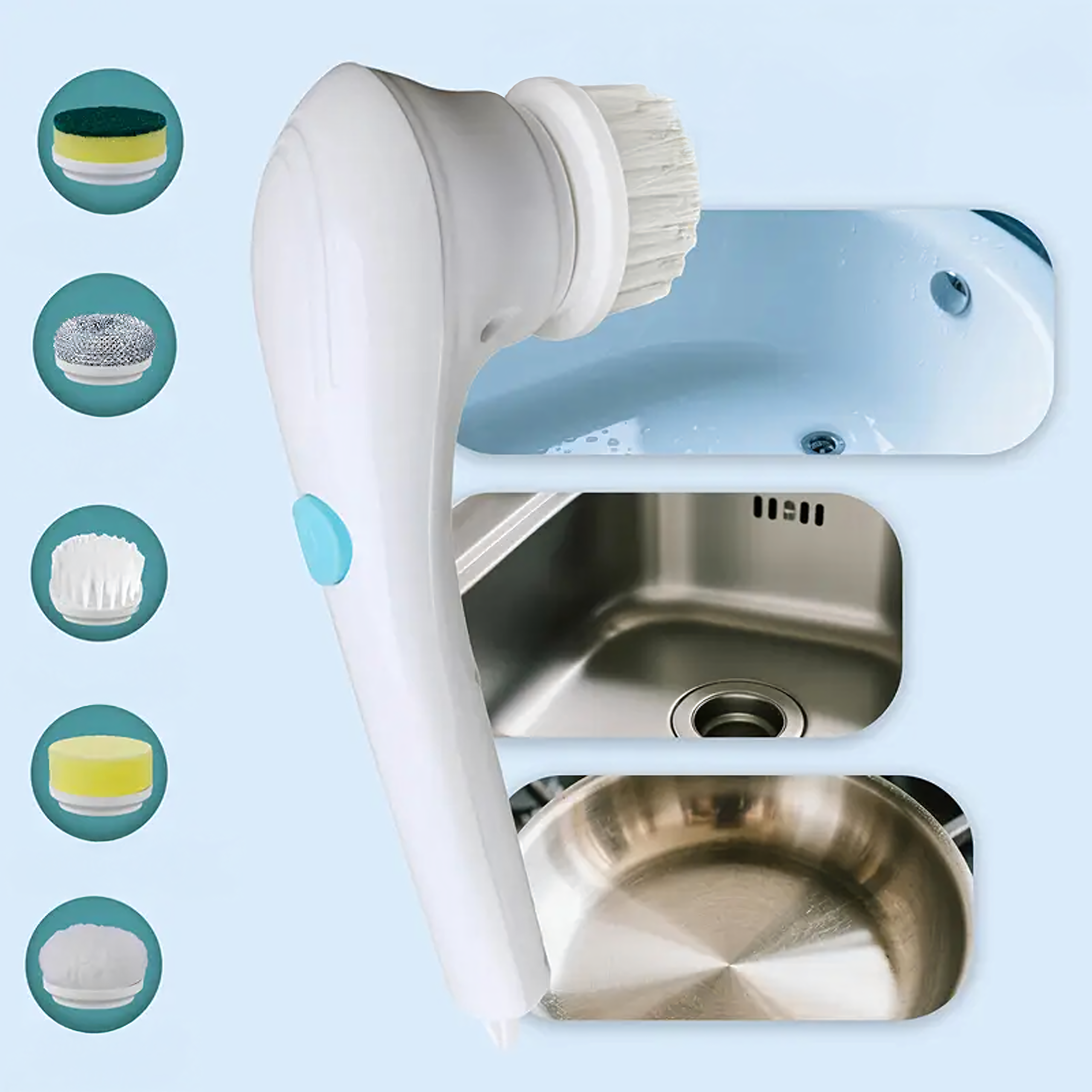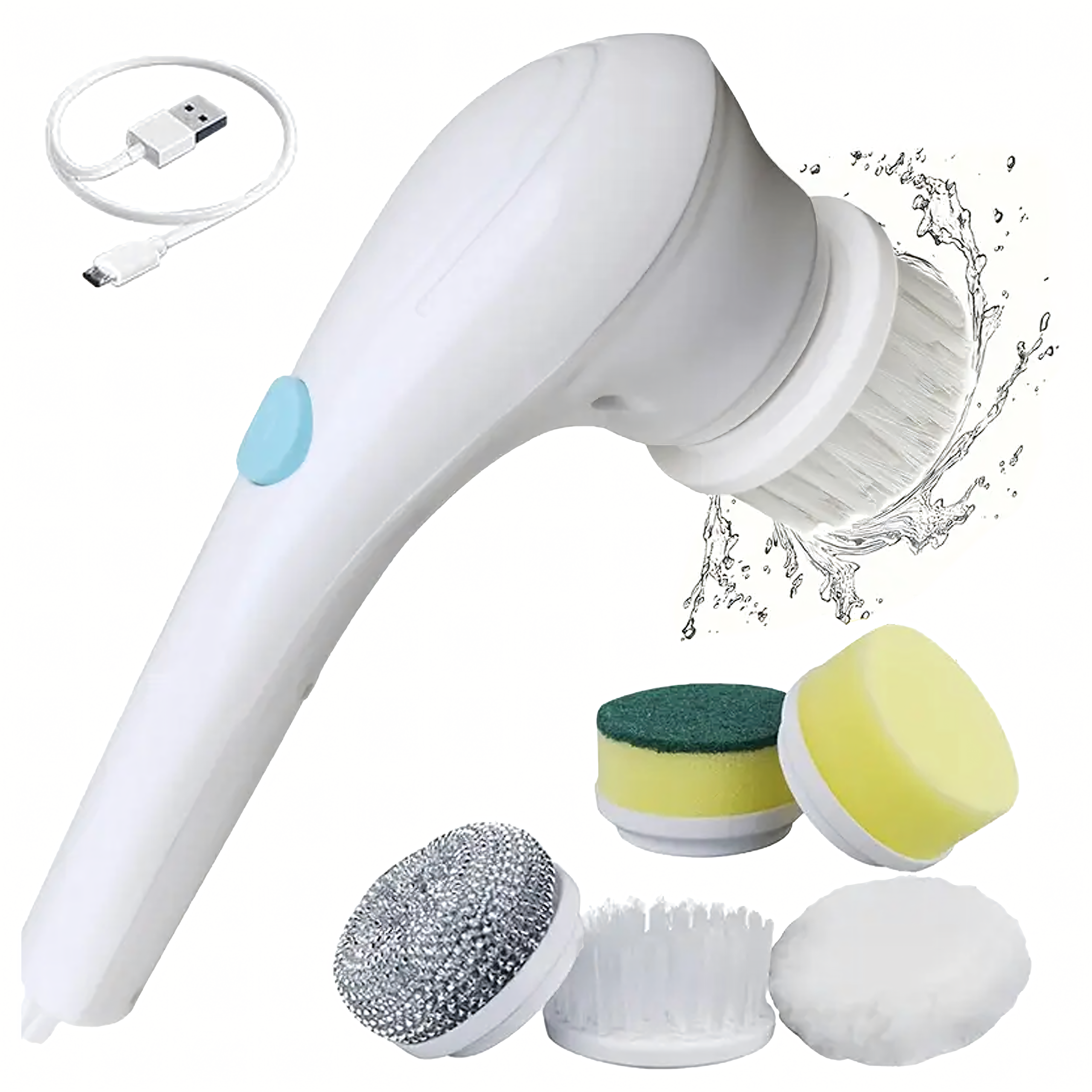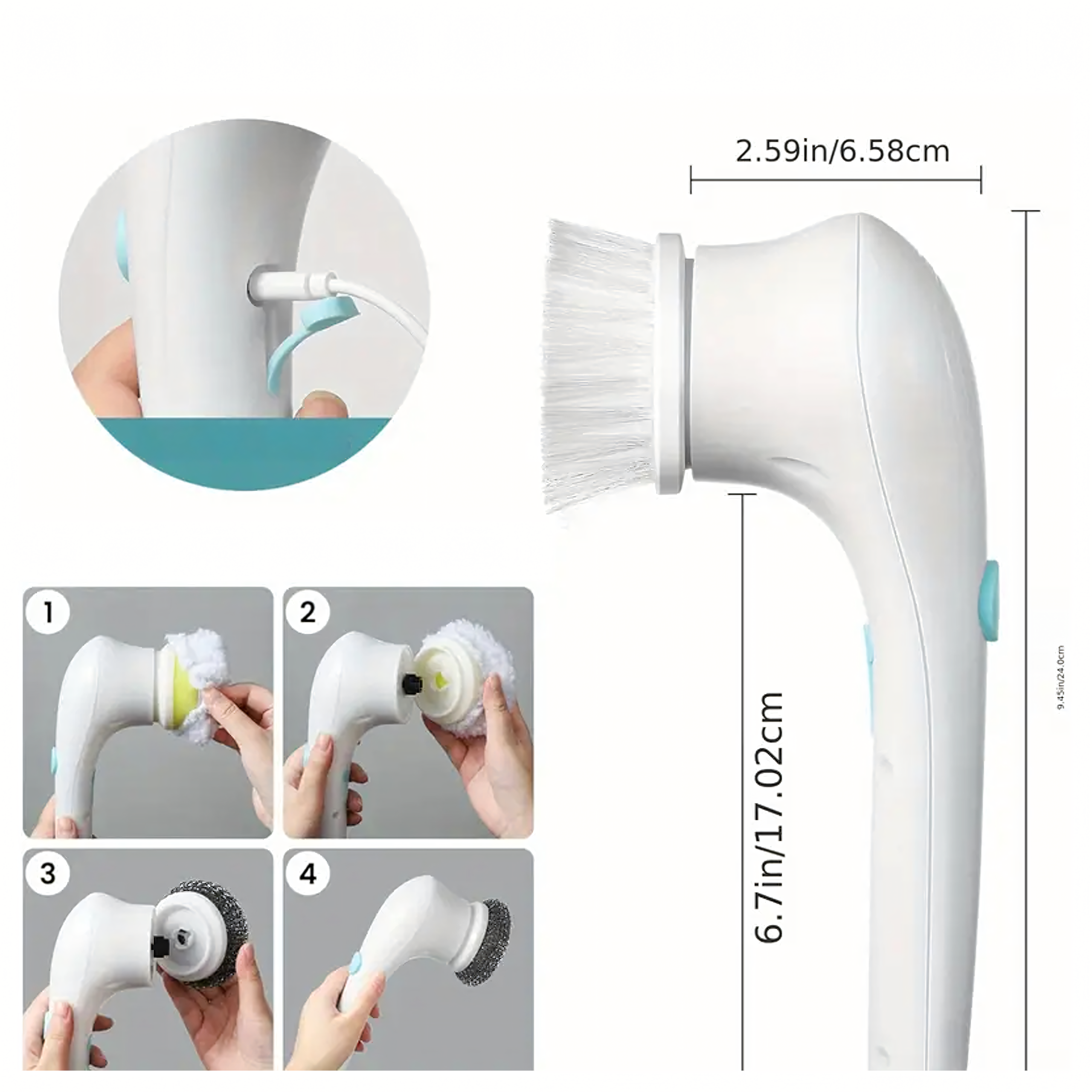 Elektryczna szczotka obrotowa 5w1 z 5 wymiennymi końcówkami do szorowania, mycia i polerowania – idealna do kuchni, łazienki, samochodu i trudno dostępnych miejsc, ładowana przez USB, mocna i trwała.