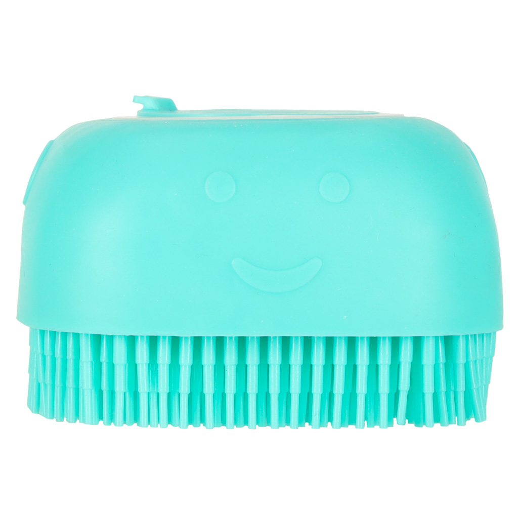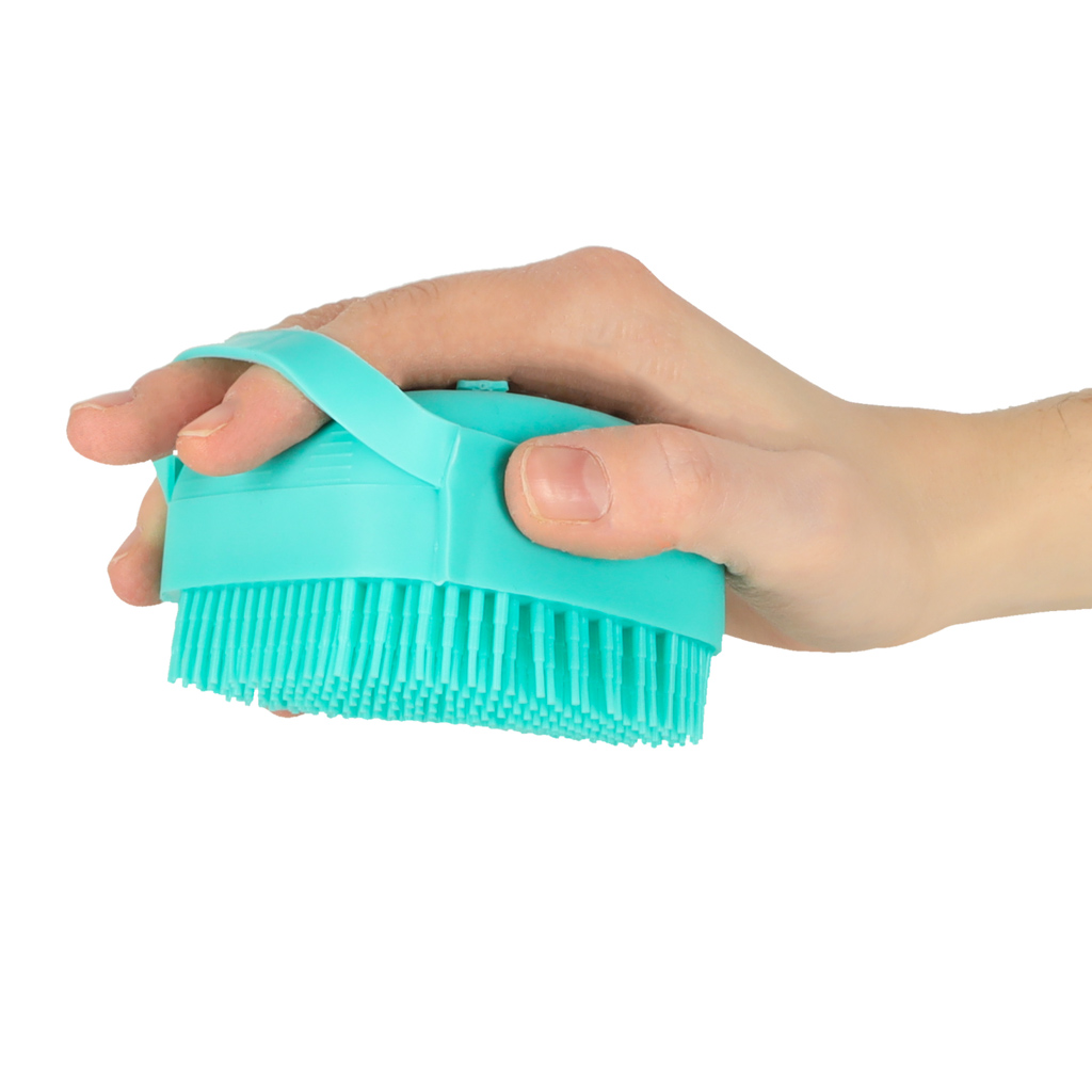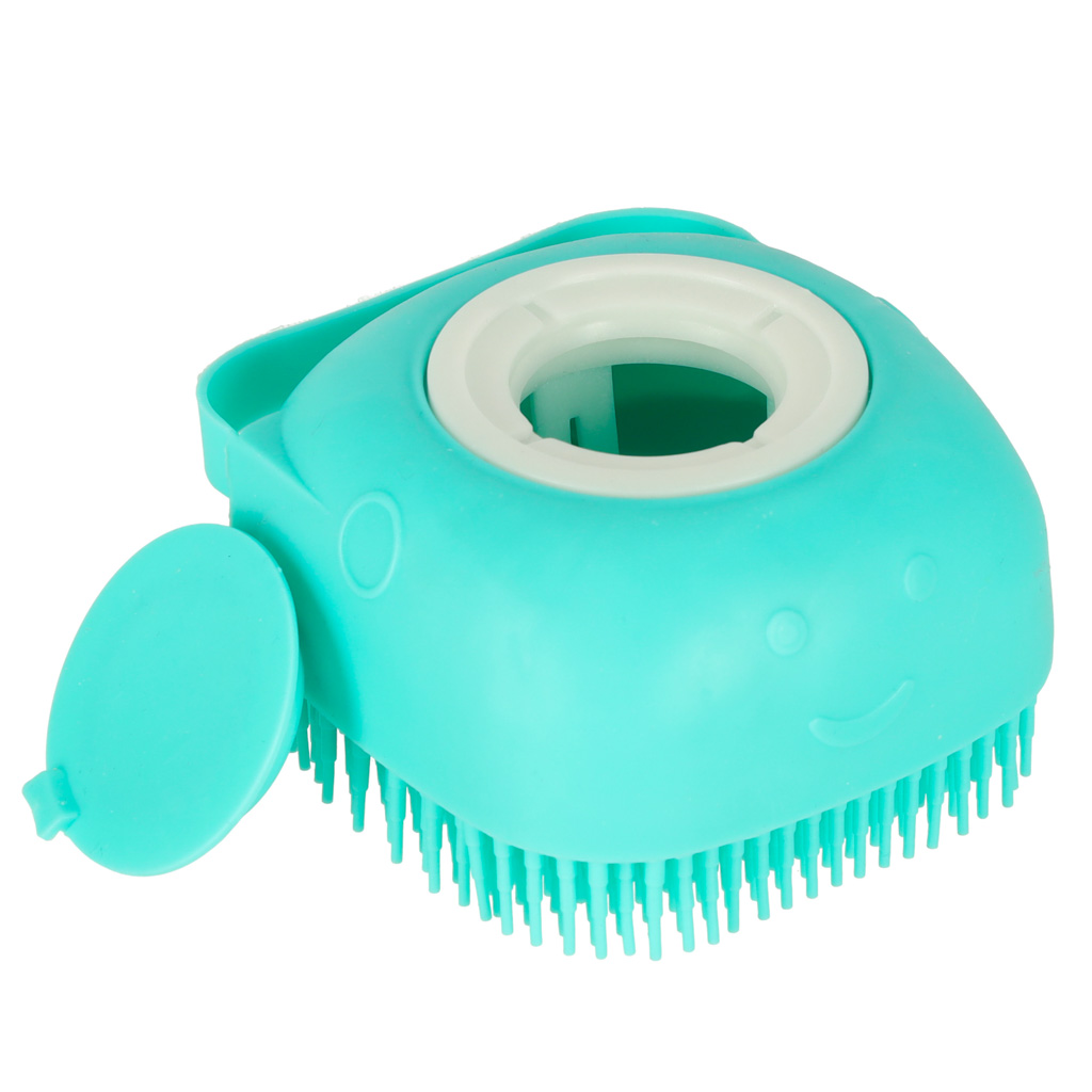 Silikonowa szczotka do mycia zwierząt. Posiada praktyczny dozownik na szampon lub płyn do mycia oraz wygodny uchwyt. Silikonowe wypustki wymasują czworonoga. Można używać na sucho lub na mokro. Prosta w użytkowaniu i czyszczeniu. Wym.: 7,5×7,5×4,5cm.