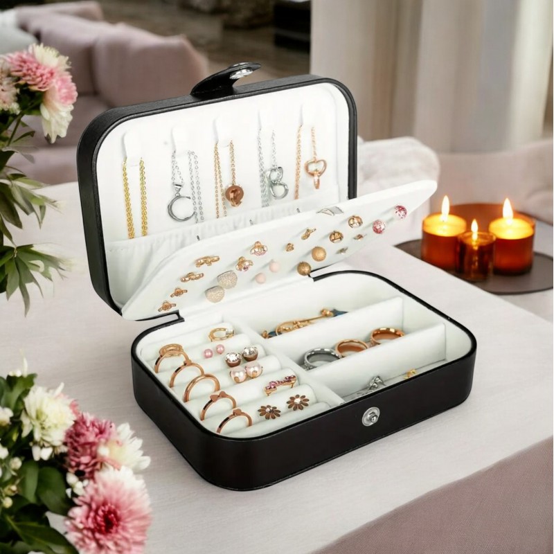 Funkcjonalna szkatułka z przegródkami oraz miejscami na naszyjniki, kolczyki i pierścionki.