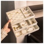 Funkcjonalna szkatułka z przegródkami oraz miejscami na naszyjniki, kolczyki i pierścionki.