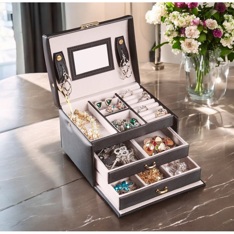 Bardzo funkcjonalny i elegancki kuferek/etui na biżuterię i zegarki Cechy produktu: