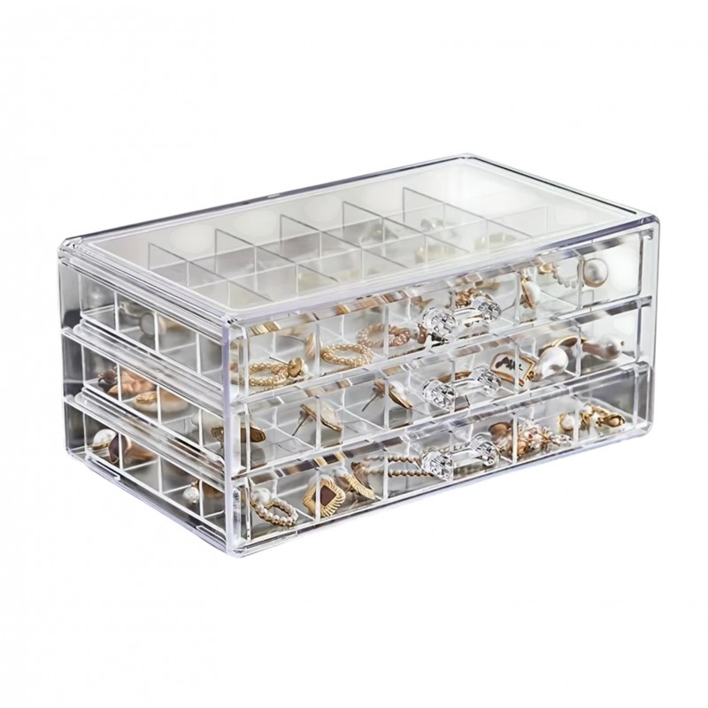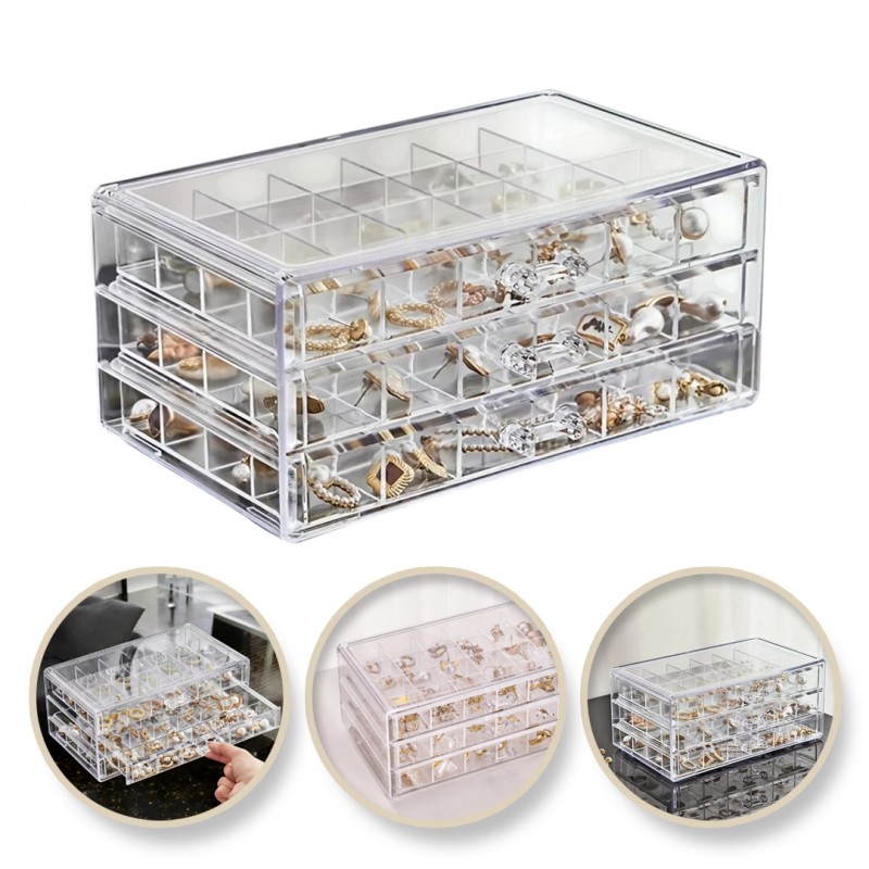Szkatułka na biżuterię, organizer transparentny – 3 szuflady, 72 przegródki Cechy produktu:
