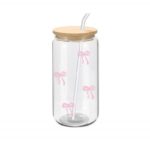 Szklanka, różowe kokardki z cyrkoniami – z rurką i bambusową pokrywką 460 ml – SZK135