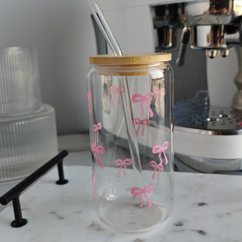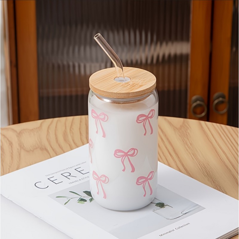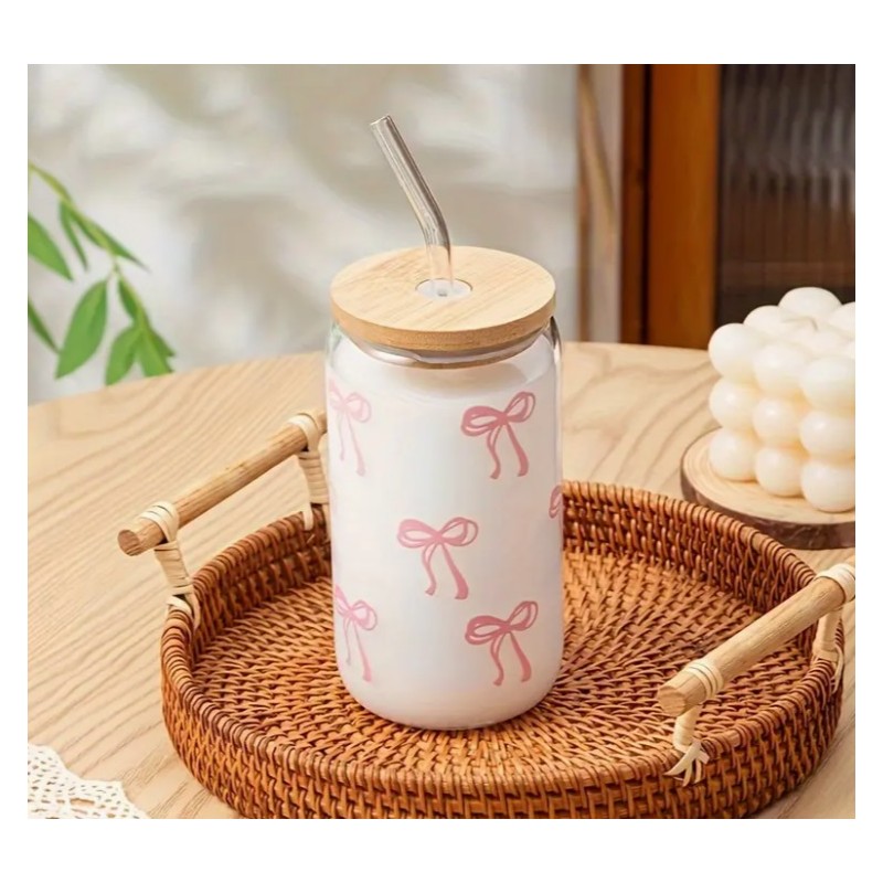 Szklanka, różowe kokardki – z rurką i bambusową pokrywką 500 ml – SZK131