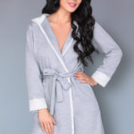 Idealny dodatek – ciepły, lekko grubszy, gładki szlafrok wykonany z dzianiny wysokiej jakości. Z kapturem i paskiem dołączonym do zestawu. Zgrabny krój, lekko sportowy styl. Brzegi w kontrastowym, jasnym kolorze, ładnie komponują się z delikatną szarością szlafroka.