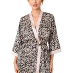 Stylowy szlafrok damski wykonany z eleganckiej, delikatnie połyskującej satyny to doskonały wybór na poranki i wieczory w domowym zaciszu. Luźny, komfortowy krój oraz długość przed kolano zapewniają wygodę i swobodę ruchów, podkreślając przy tym kobiecą sylwetkę. Szlafrok ozdobiony jest efektownym nadrukiem, który dodaje mu charakteru i wyjątkowego stylu. Rękawy o długości 7/8 nadają całości lekkości i nowoczesnego wyglądu. Model wiązany jest w talii satynowym paskiem, który pozwala na idealne dopasowanie. To idealne połączenie komfortu, elegancji i subtelnej zmysłowości, niezastąpiony element kobiecej garderoby.