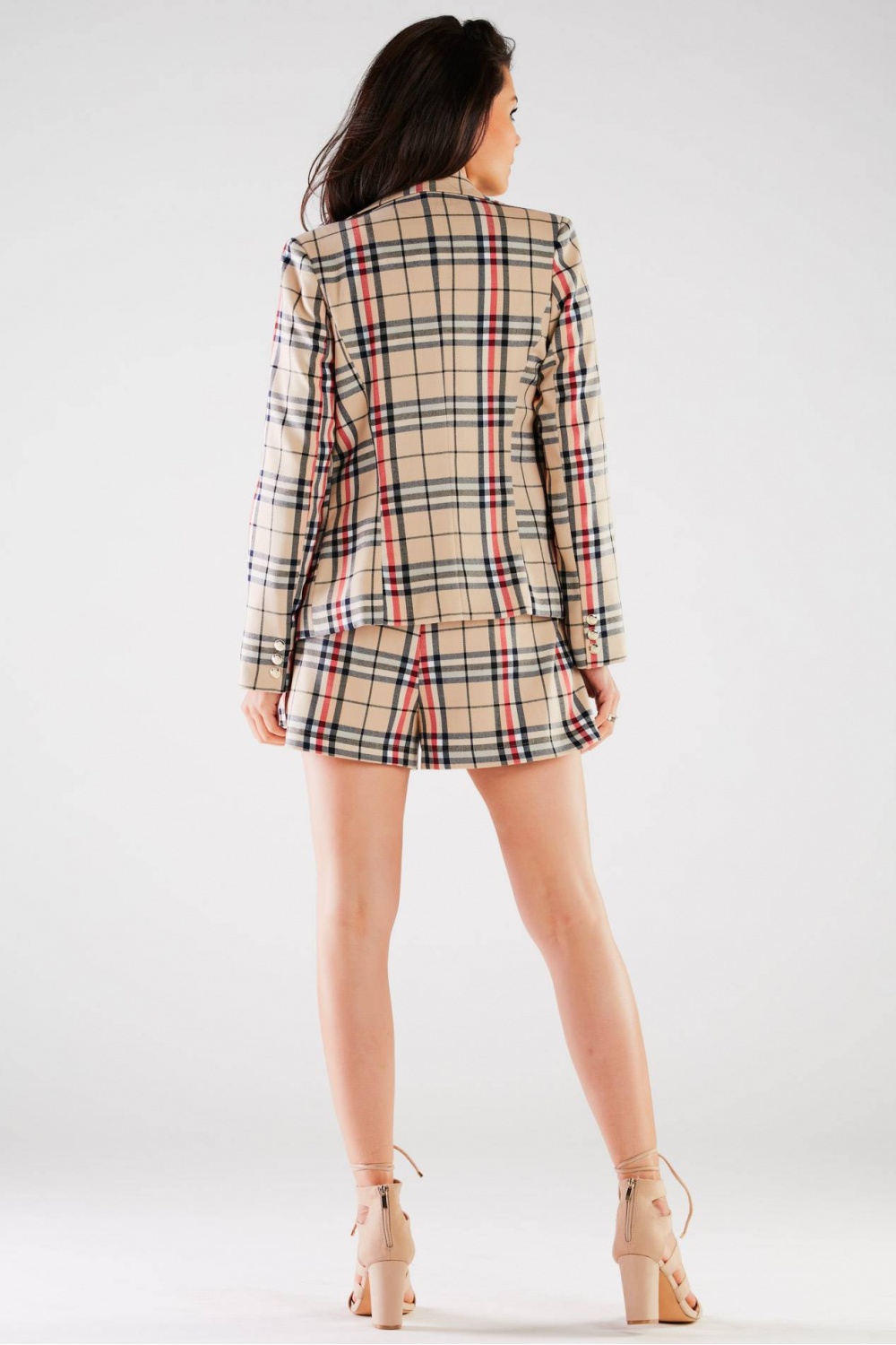 Luźne spodenki z wysokim stanem, wiązane w pasie, na przodzie z kontrafałdami i kieszeniami w szwach bocznych. Z tyłu spodenki mają wszytą gumę. Świetnie wyglądają w połączeniu z naszym żakietem A439. Wykonane i zaprojektowane w Polsce.