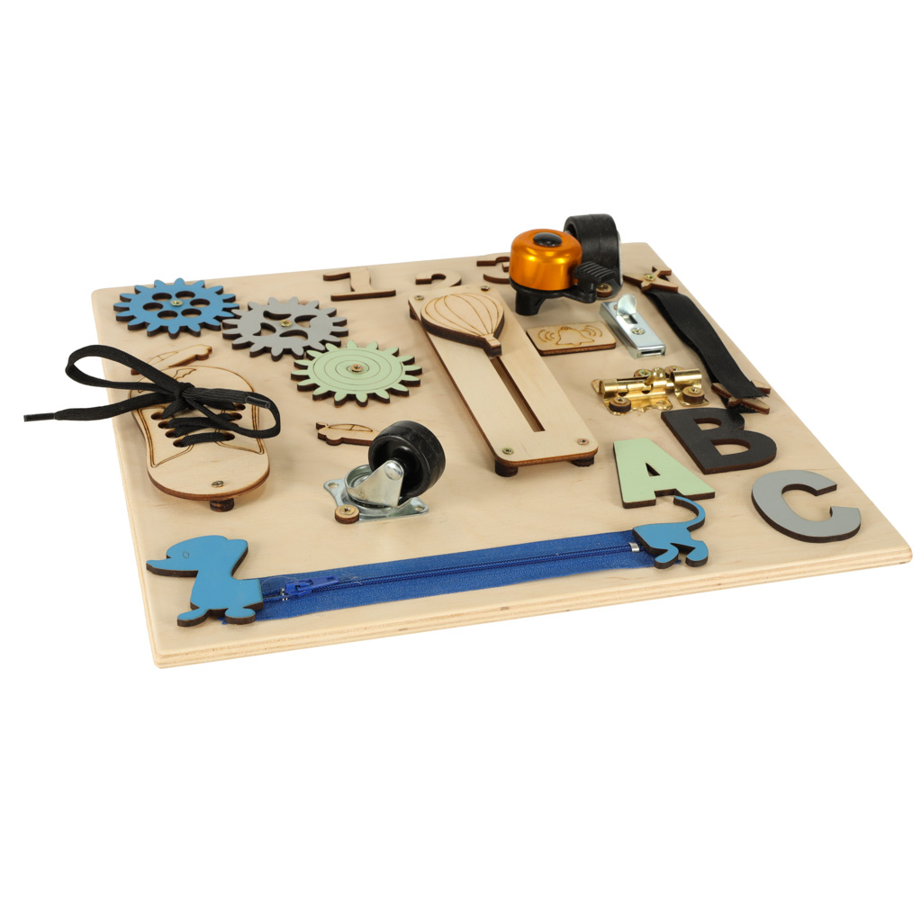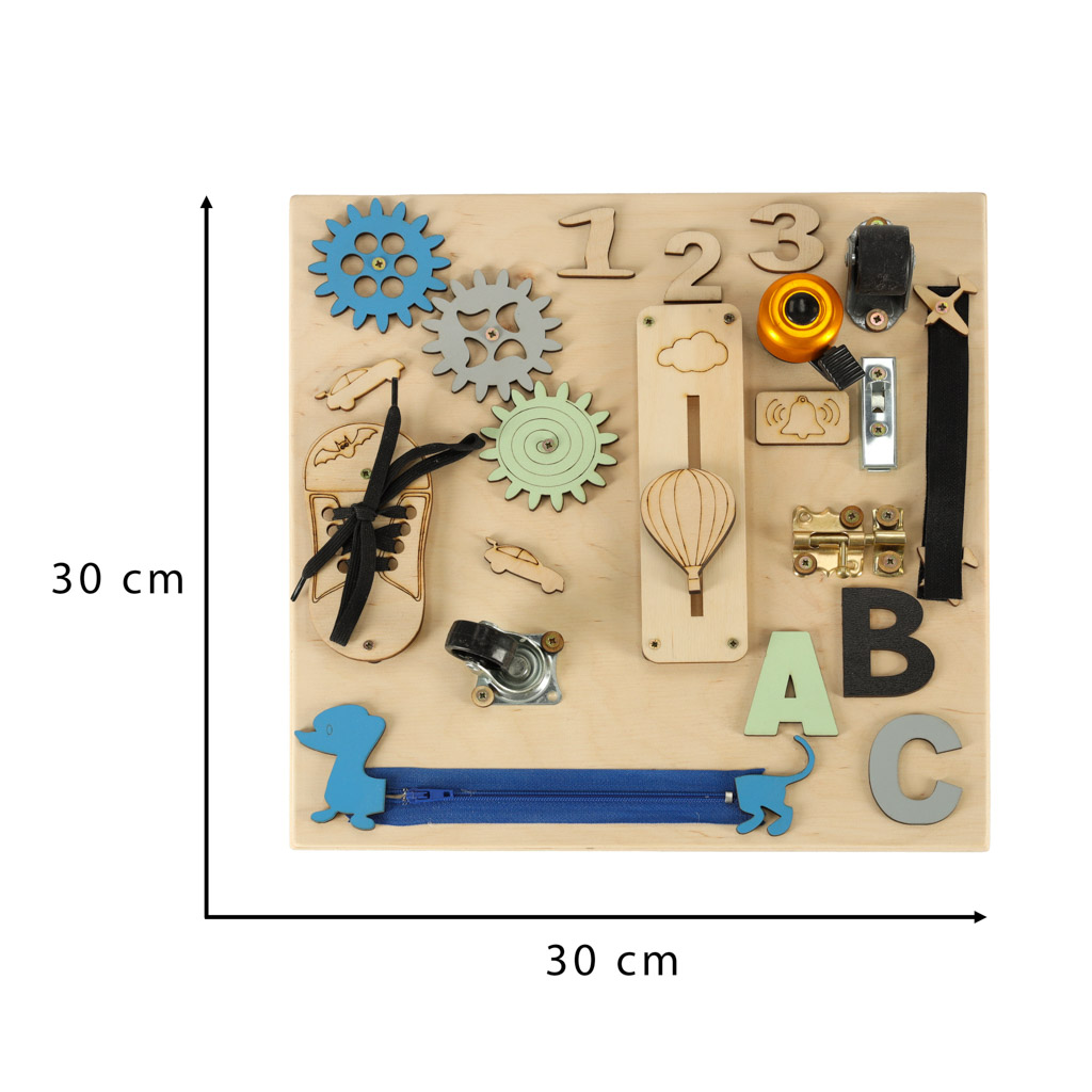 Tablica manualna, która zachęca dzieci do poznawania świata w bezpieczny i przyjazny sposób. Dzięki różnorodnym elementom np.: zębatki, zasuwka czy zamek blyskawiczny, dzieci zaspokajają swoją wrodzoną ciekawość. Tworzywo: drewno. Wym.: 30x30cm