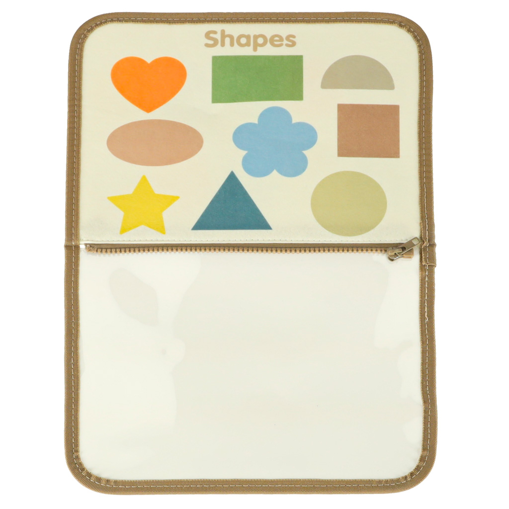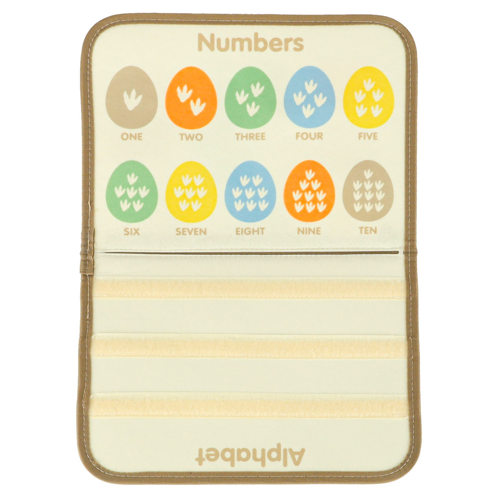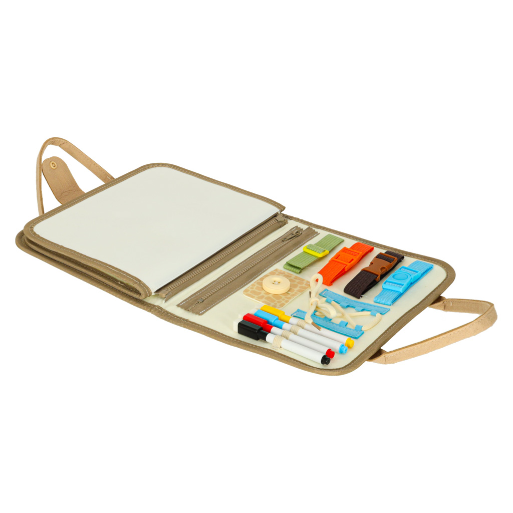 Tablica manipulacyjna Montessori w formie teczki (filc, 28×22×3,5 cm, po rozłożeniu 45 cm), z elementami motorycznymi (zamki, guziki, klamry), edukacyjnymi (litery, cyfry, dinozaury) i kreatywnymi (tablica suchościeralna, 4 markery). Dla dzieci 3+.