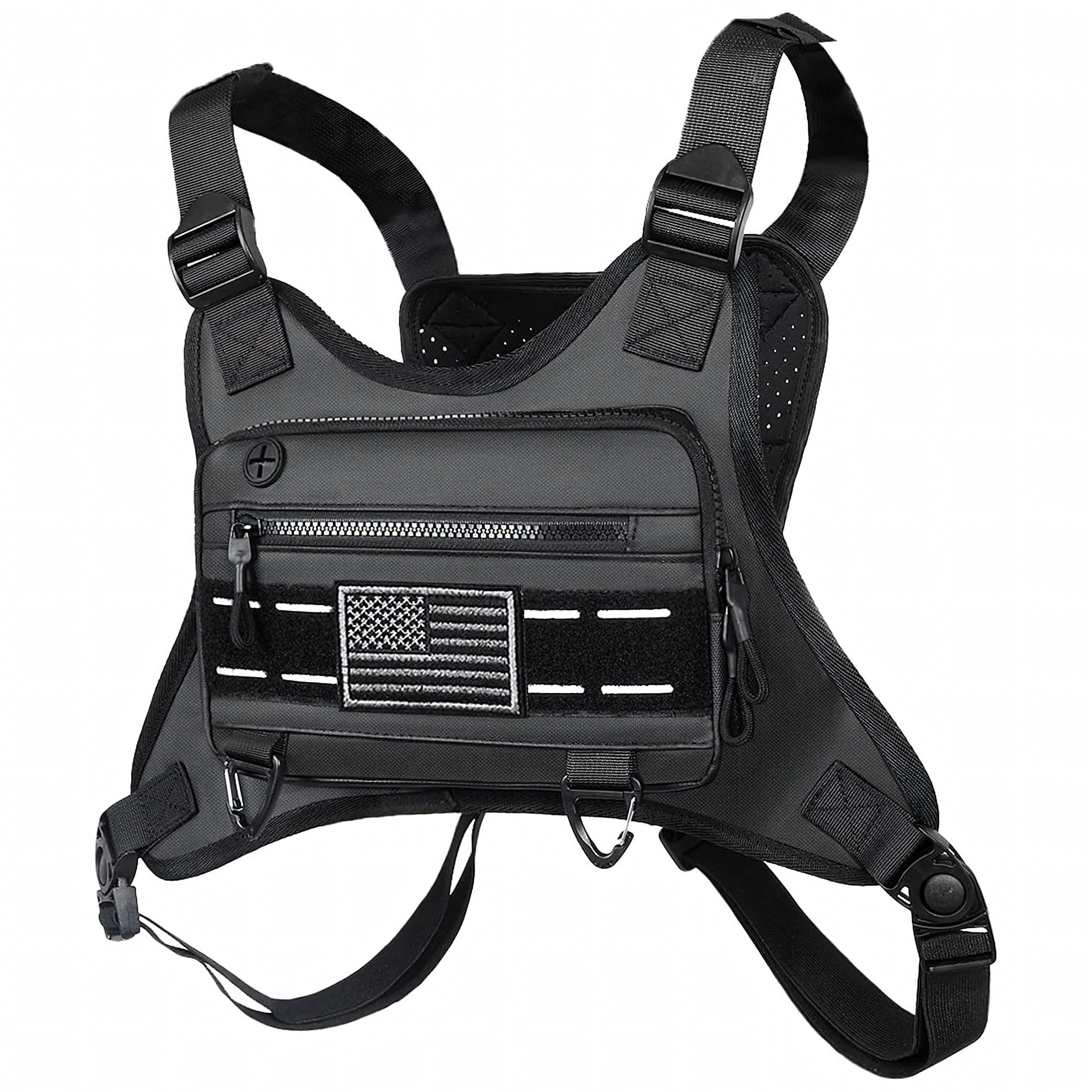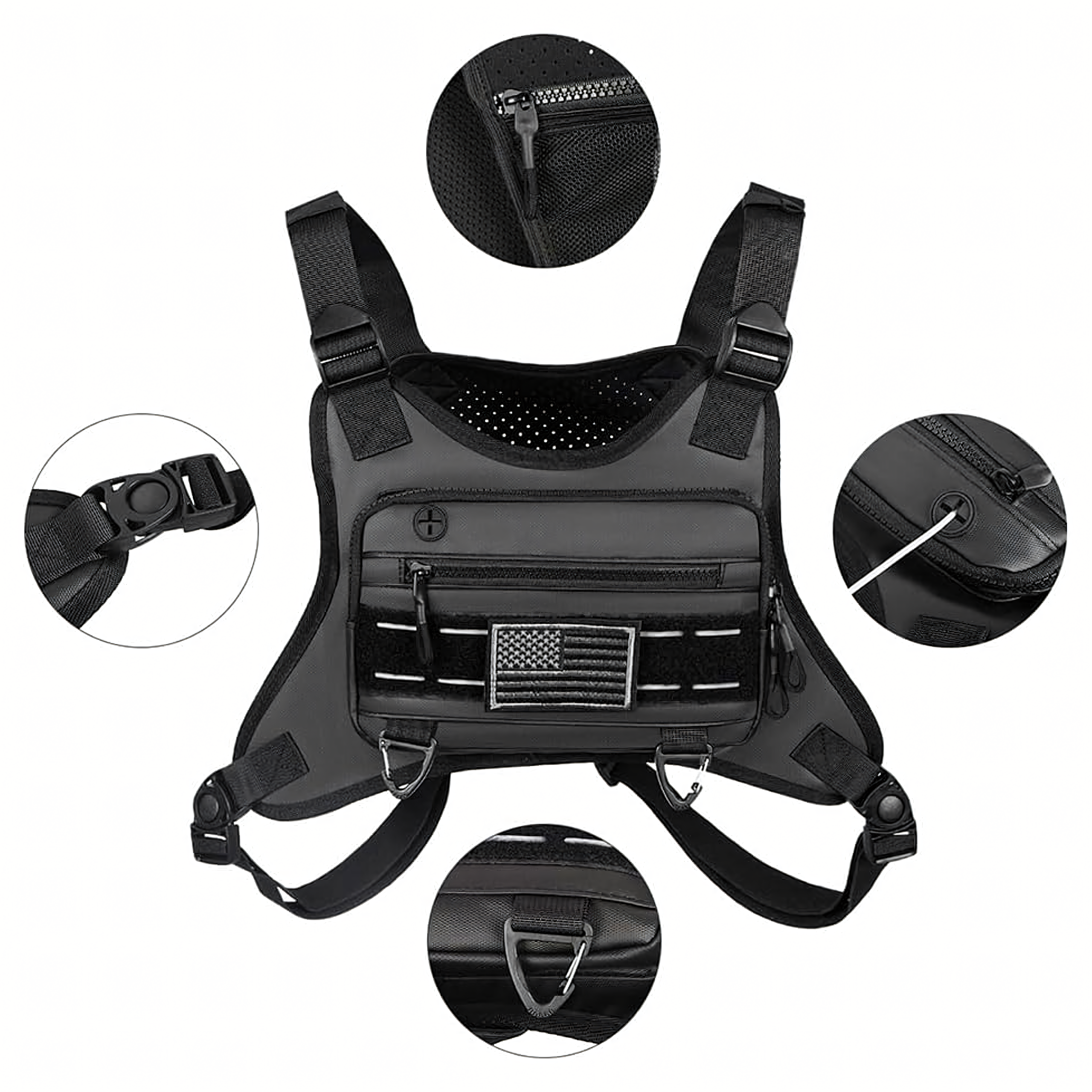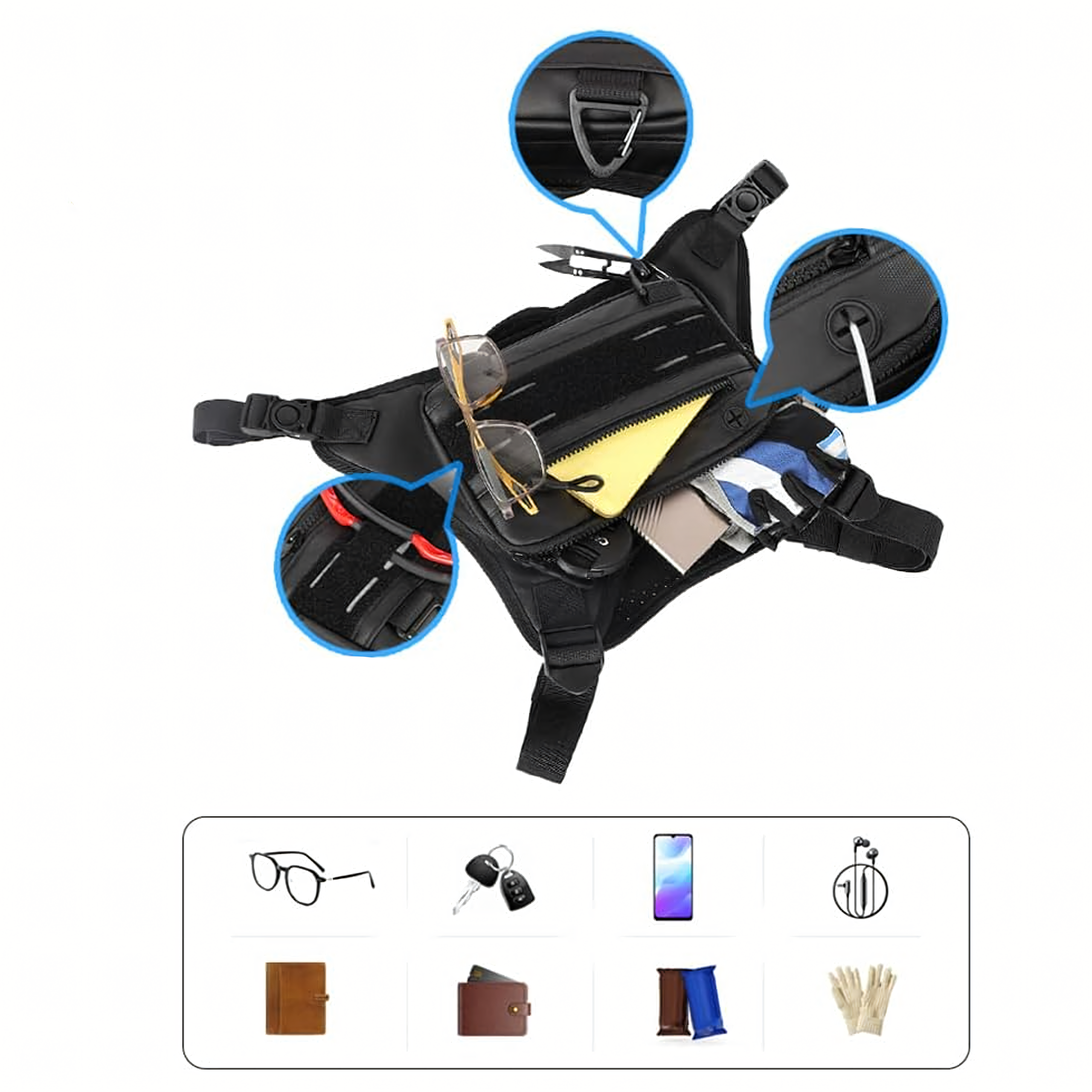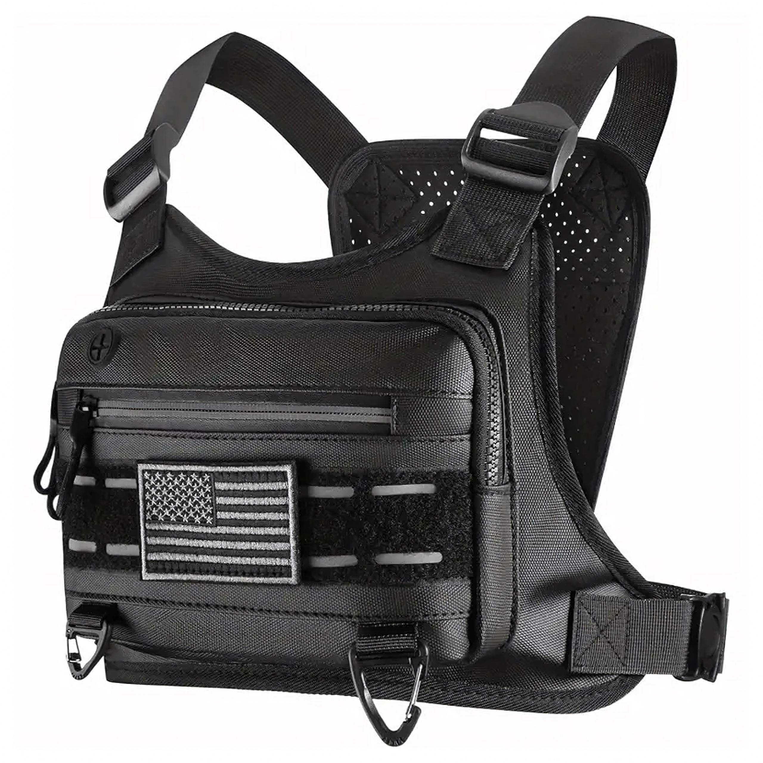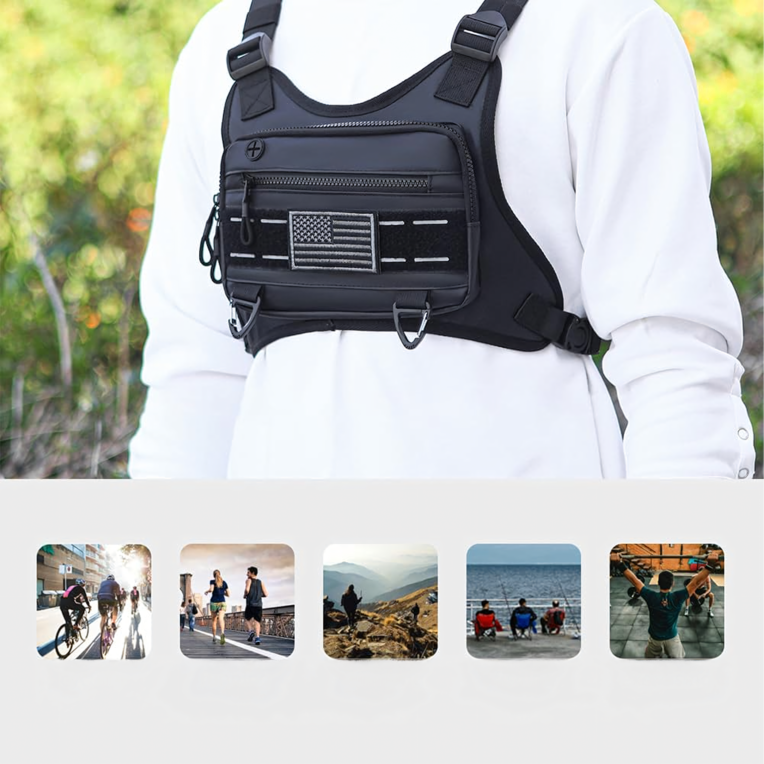 Taktyczna torba na klatkę piersiową z wodoodpornego nylonu 600D – lekka, pojemna i regulowana, idealna do biegania, turystyki, roweru czy zastosowań taktycznych, z oddychającym tyłem, licznymi kieszeniami i gniazdem słuchawkowym.