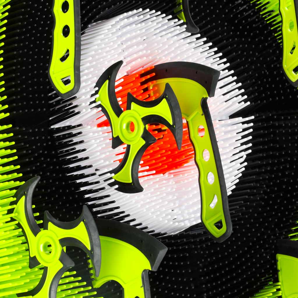 Plastikowe toporki i shuriken’y są obtoczone miękkim silikonem,