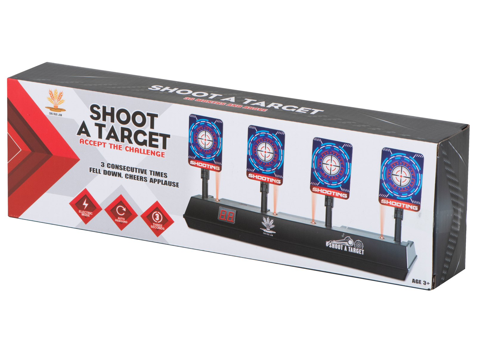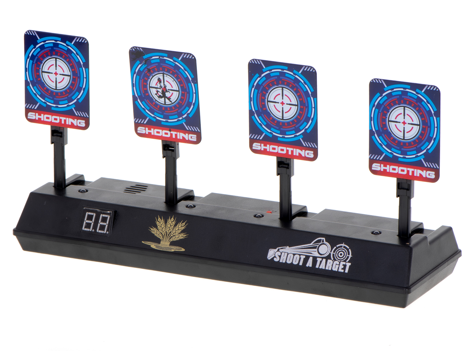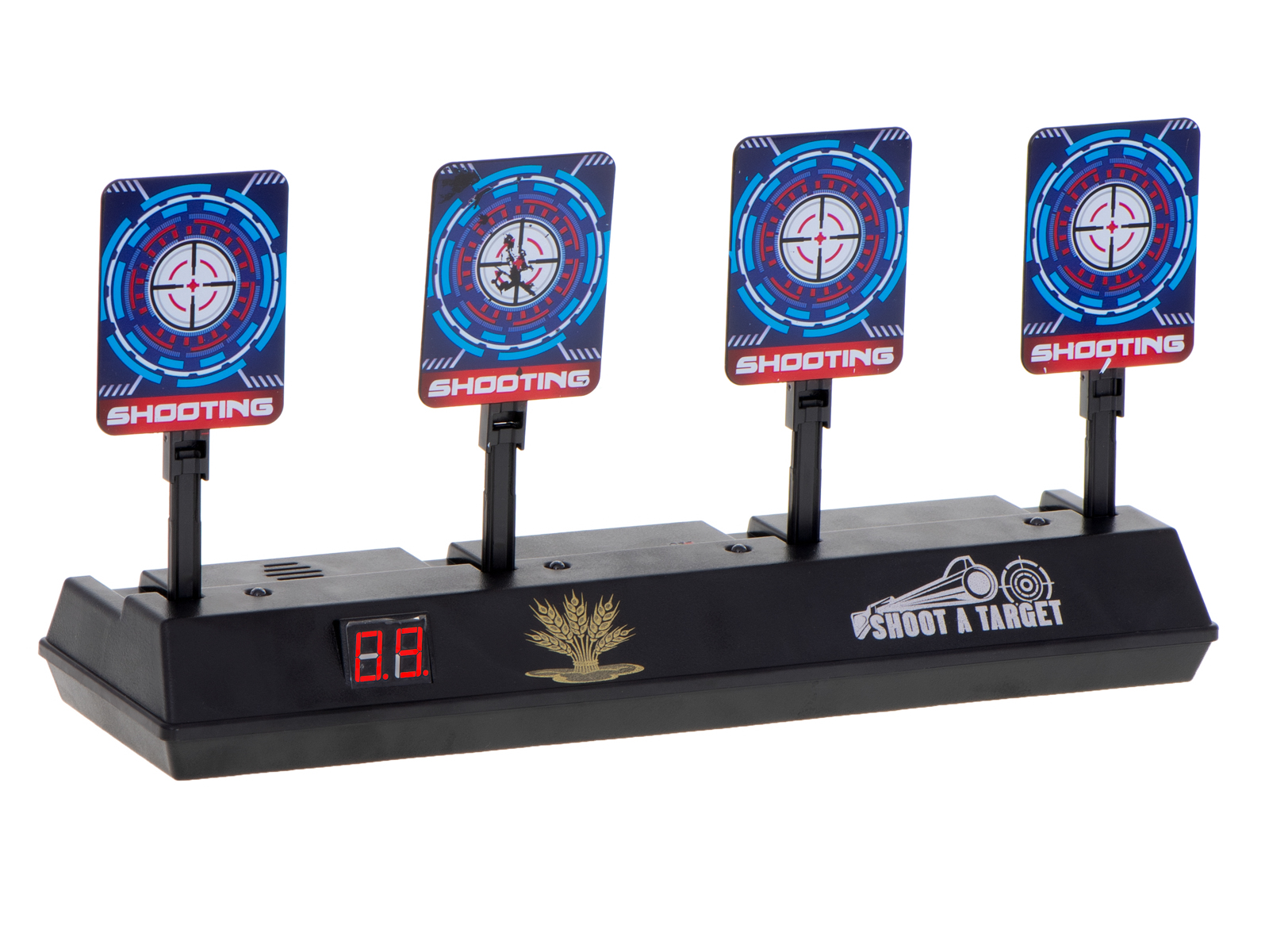 Elektroniczna tarcza do strzelania. Idealna dla miłośników broni. Doskonale ćwiczy celność. Posiada efekty świetlne i dźwiękowe W zestawie: tarcza z 4 celami. Zasilanie: 3 baterie 1.5V AA (brak w zestawie). Wym. tarczy: 33x10x17cm.