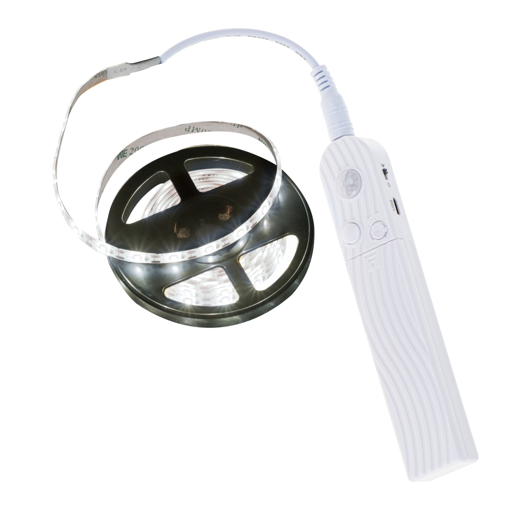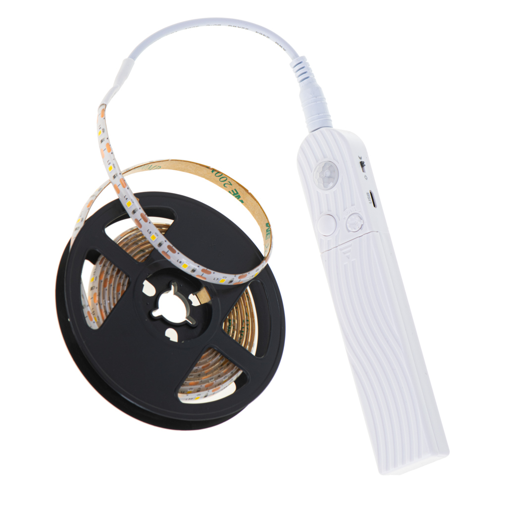 Taśma LED z czujnikiem ruchem. Przydatne akcesorium, które może pełnić funkcję oświetlenia orientacyjnego na korytarzu, schodach czy w szafie. Posiada wbudowany timer. Kolor światła: zimny biały. Długość: 2 metry. Zasilanie: 4 baterie AAA / przewód USB.