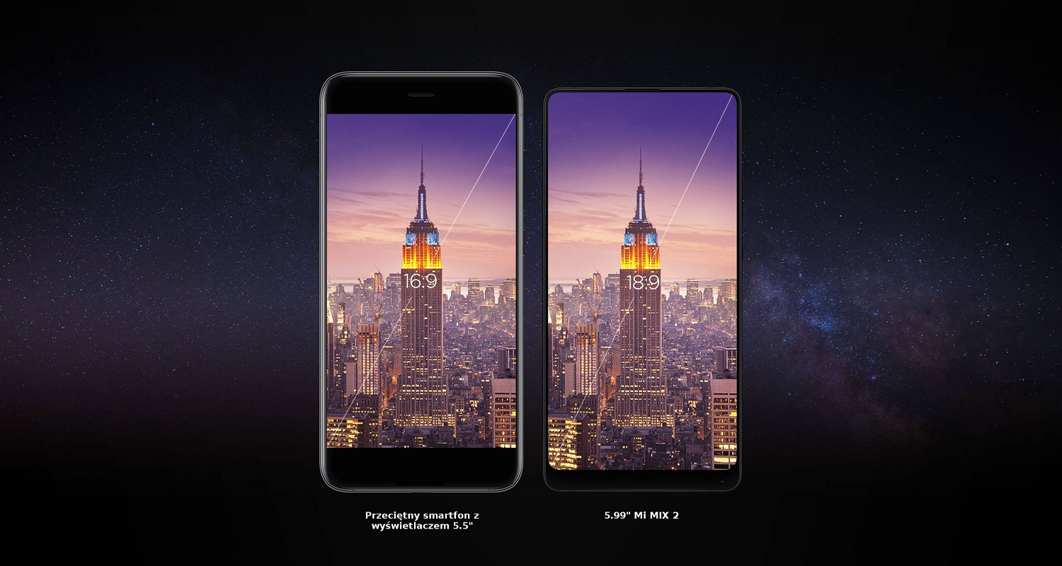 Z Mi MIX 2 doświadczysz imponującej technologii full display. Krawędzie w Mi MIX 2 są o 12% węższe niż w jego poprzedniku, dzięki czemu osiągnięto współczynnik proporcji ekranu 18:9 – to efekt naszej nieustannej pogoni za innowacjami w technologii.