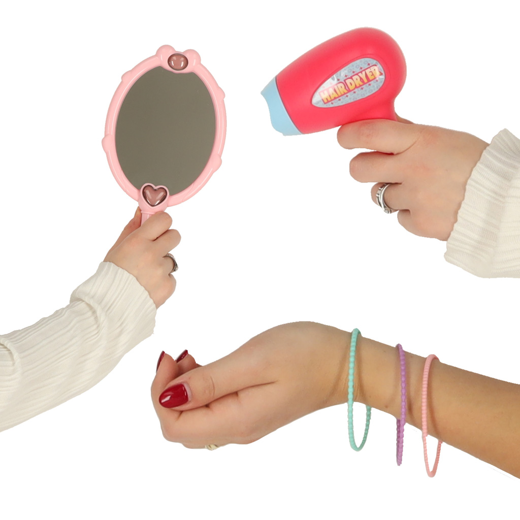 Fantastyczny zestaw kosmetyczny z akcesoriami. Posiada niezbędne przyrządy, aby stać się profesjonalną fryzjerką lub kosmetyczką. Zapakowany w praktyczną walizkę, którą można wszędzie zabrać. Zabawa pobudzi wyobraźnię. Wymiary walizki: 32x19x12cm.