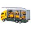 Zestaw pojazdów budowlanych w dużej ciężarówce. Komplet zawiera ciężarówkę, w której umieszczonych jest 6 maszyn: betoniarka, wózek widłowy, koparka, spychacz, wywrotka i walec drogowy. Wymiary ciężarówki: 36x15x10cm, wymiary maszyn: ok. 8x4x3cm.