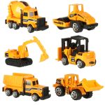 Zestaw pojazdów budowlanych w dużej ciężarówce. Komplet zawiera ciężarówkę, w której umieszczonych jest 6 maszyn: betoniarka, wózek widłowy, koparka, spychacz, wywrotka i walec drogowy. Wymiary ciężarówki: 36x15x10cm, wymiary maszyn: ok. 8x4x3cm.