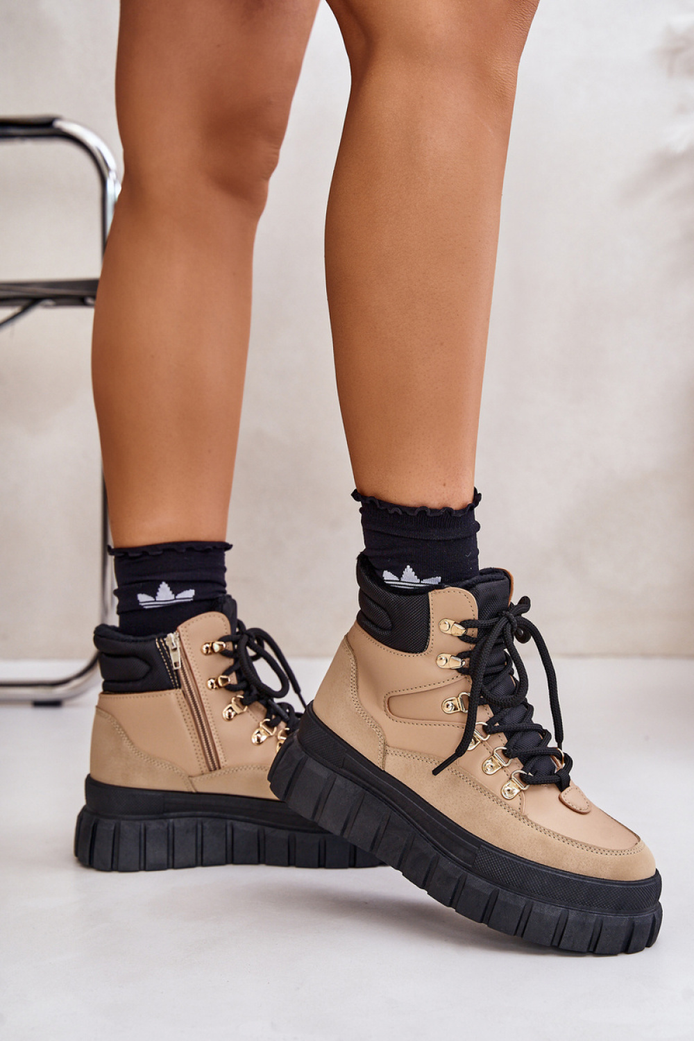 Damskie botki wykonane z eko skóry Osadzone na masywnej platformie, która doskonale odizoluje od zimnego podłoża. Model ten posiada sznurowanie oraz dodatkowe zapięcie na zamek. Ocieplenie w postaci koca obuwniczego zapewni komfort i ciepło. To obuwie, które nie tylko jest stylowe, ale również funkcjonalne. Idealne dla kobiet, które cenią sobie wygodę i modny wygląd.