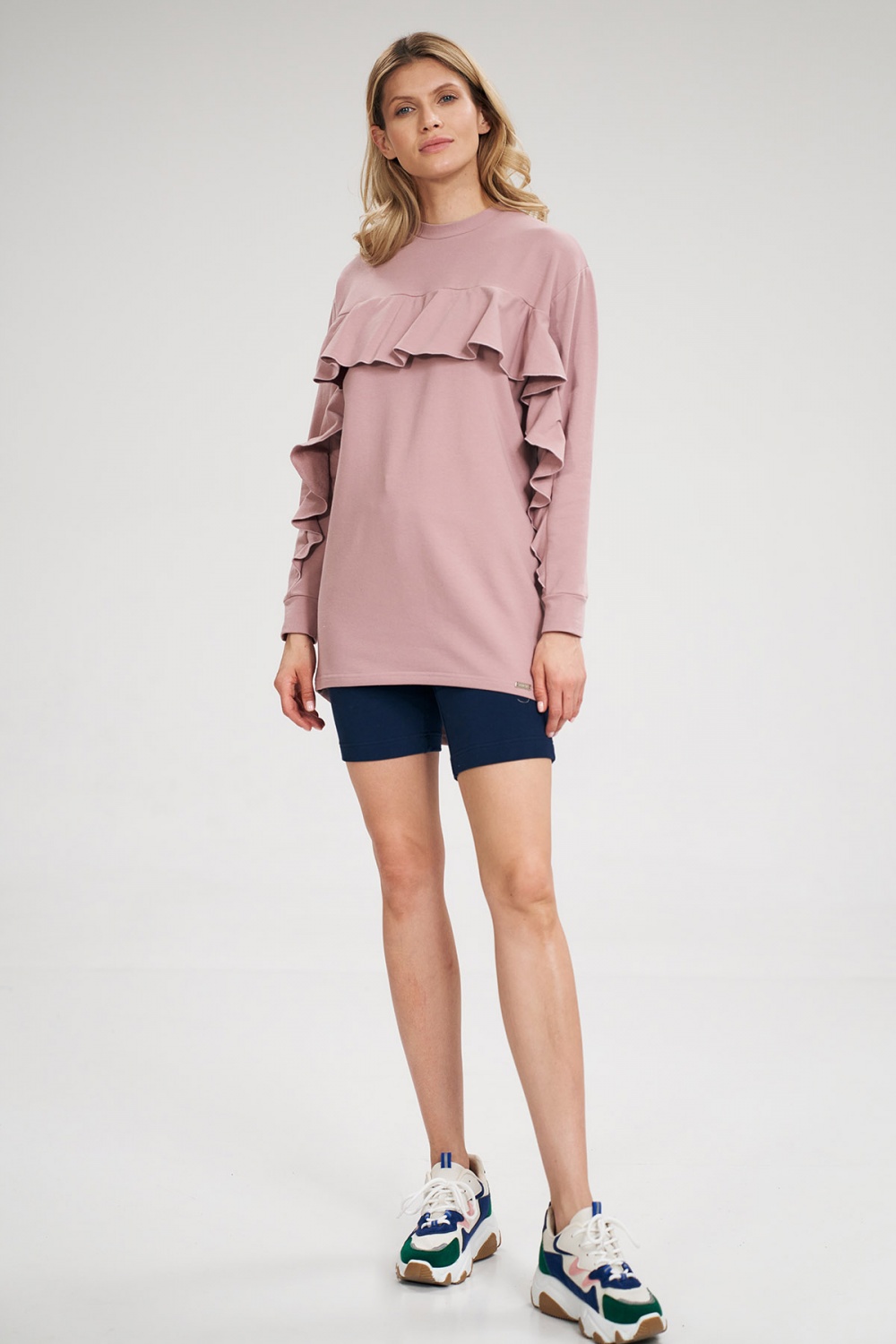 Prosta bawełniana tunika, długi rękaw ozdobiony falbaną, która przechodzi nad linię biustu. Dekolt pod szyję. Dłuższy półokrągły tył.