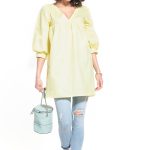 Tunika z dekoltem w szpic, lekko marszczona na linii piersi, z bufiastym rękawem 3/4 zakończonym mankietem.