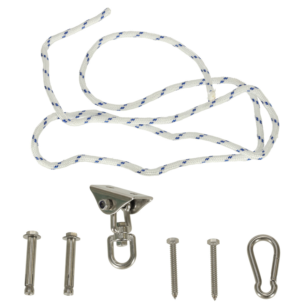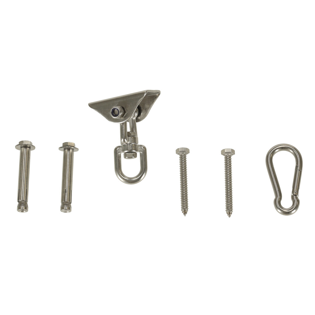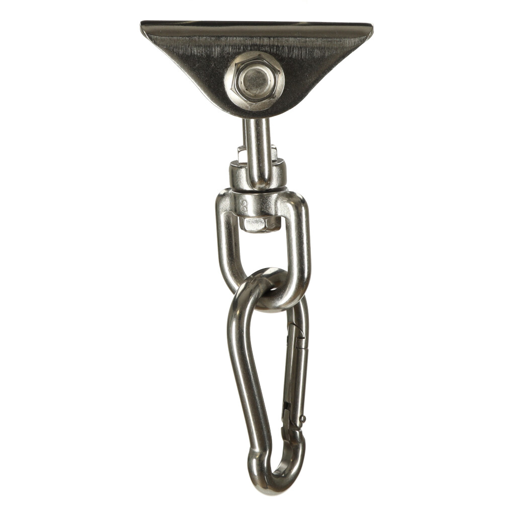 Uchwyt do mocowania huśtawek umożliwi powieszenie podwieszanych siedzisk w każdym dowolnym miejscu. Głowica obraca się o 360°, dzięki czemu bujanie się na huśtawce staje się niezwykle przyjemne. Tworzywo: stal 304. Wymiary blaszki: 7 cm x 4 cm.