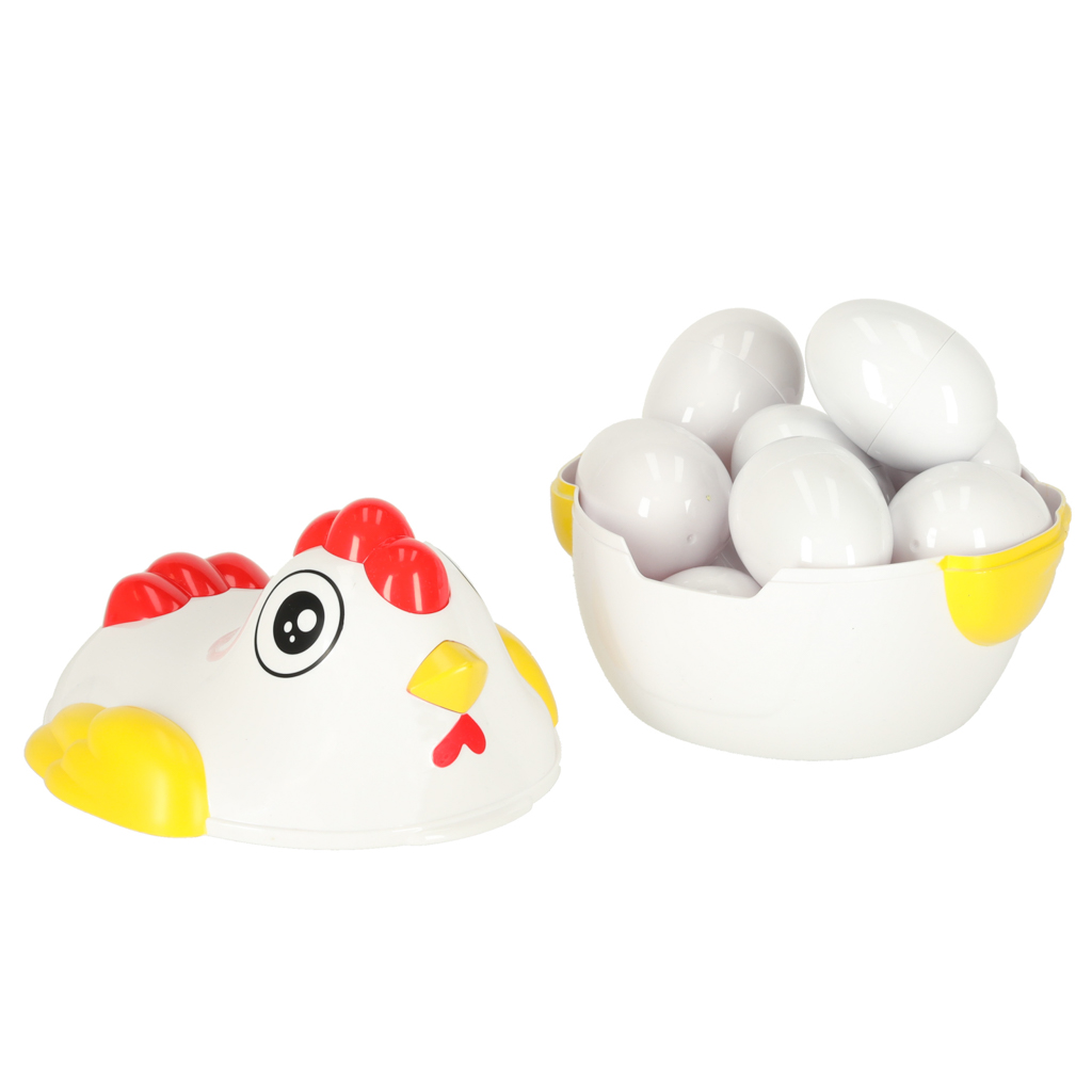 Edukacyjny sorter dla dzieci 18m+ w formie kury (15×16×16,5 cm) z 12 jajkami (6,5×4,5 cm), w których każda połówka zawiera inny kształt i kolor. Dziecko dopasowuje połówki jajek na zasadzie parowania kolorów i zgodnych form geometrycznych.