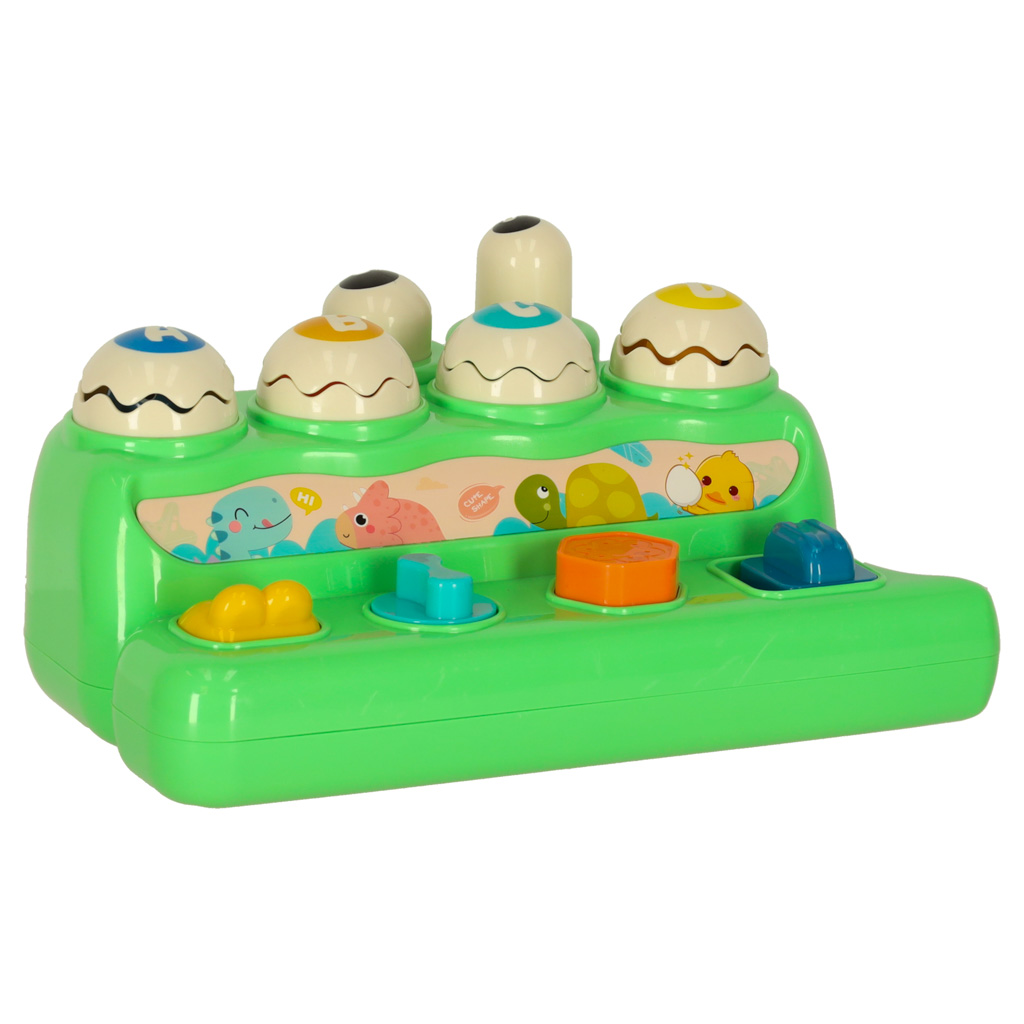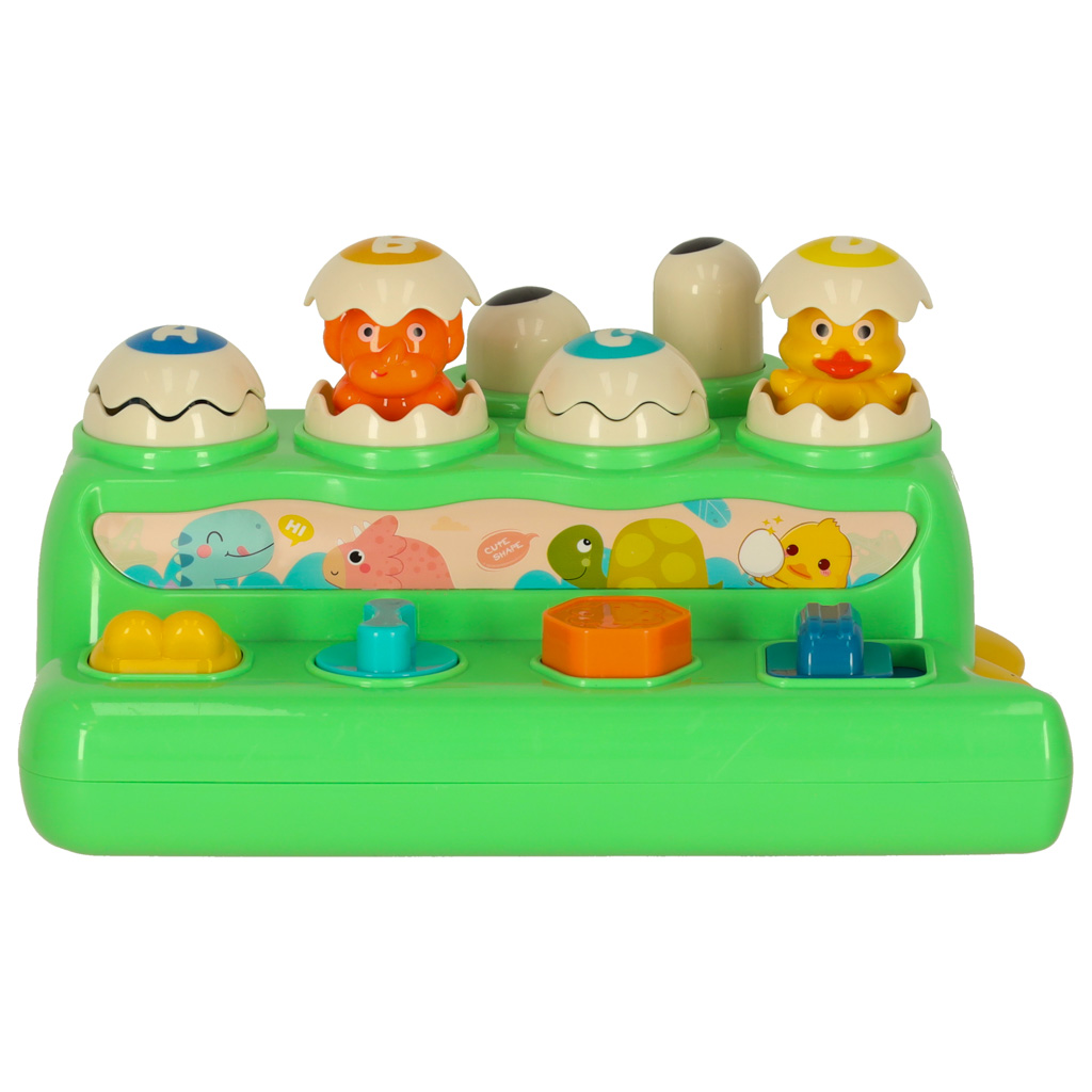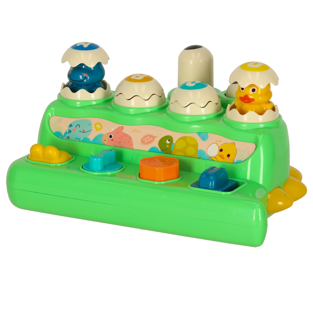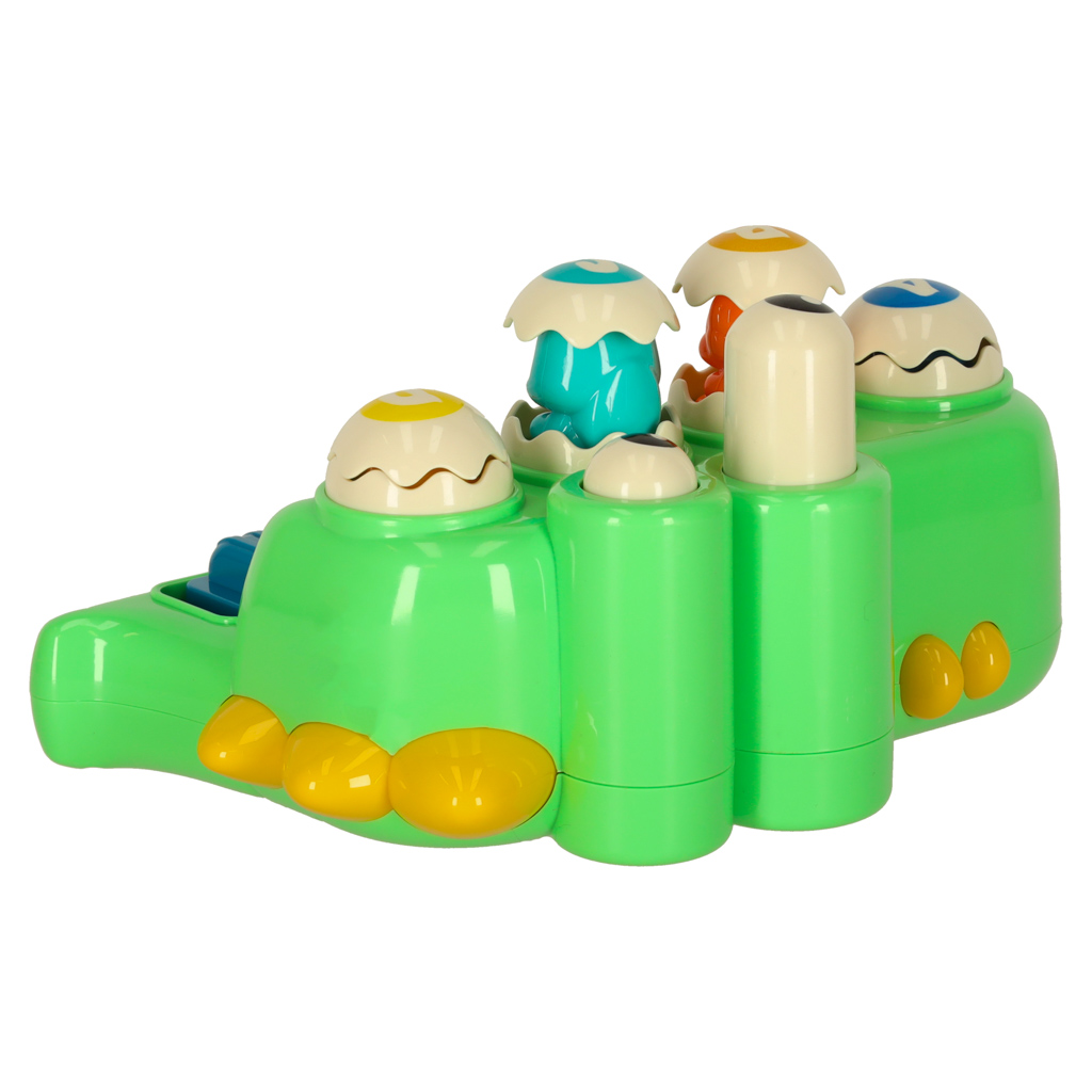 Parametry techniczne: Wiek: od 18 miesięcy. Elementy: krokodyl, młotek, kolorowe jajka. Funkcje: obracanie, uderzanie, wbijanie. Materiał: tworzywo sztuczne. Kolor: zielony z kolorowymi elementami. Kolor młotka: pomarańczowy. Wymiary zabawki: Szerokość: 2