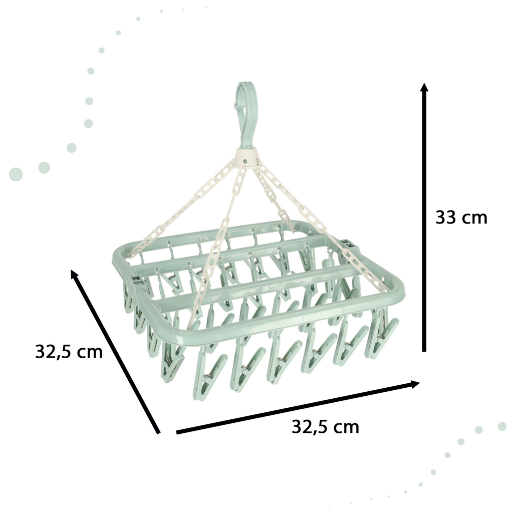 Praktyczny wieszak suszarka na drobne pranie – skarpetki lub bieliznę. Trzydzieści dwie klamerki gwarantują wystarczającą ilość miejsca na rozwieszenie rzeczy, oszczędzając przy tym miejsce na suszarce. Tworzywo: plastik. Wymiary: 32,5 x 32,5 x 33 cm.