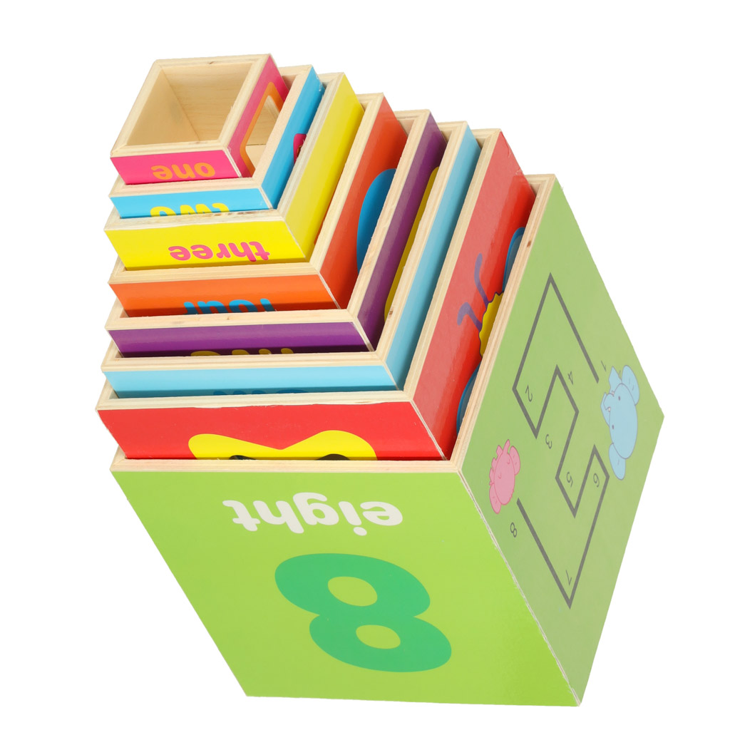 Edukacyjna układanka drewniana XXL o wysokości 71 cm, składająca się z 8 pudełek (4,6–14 cm) i 7 klocków w kształtach geometrycznych. Wykonana z drewna. Uczy liczenia, kształtów, kolorów i słówek w języku angielskim.
