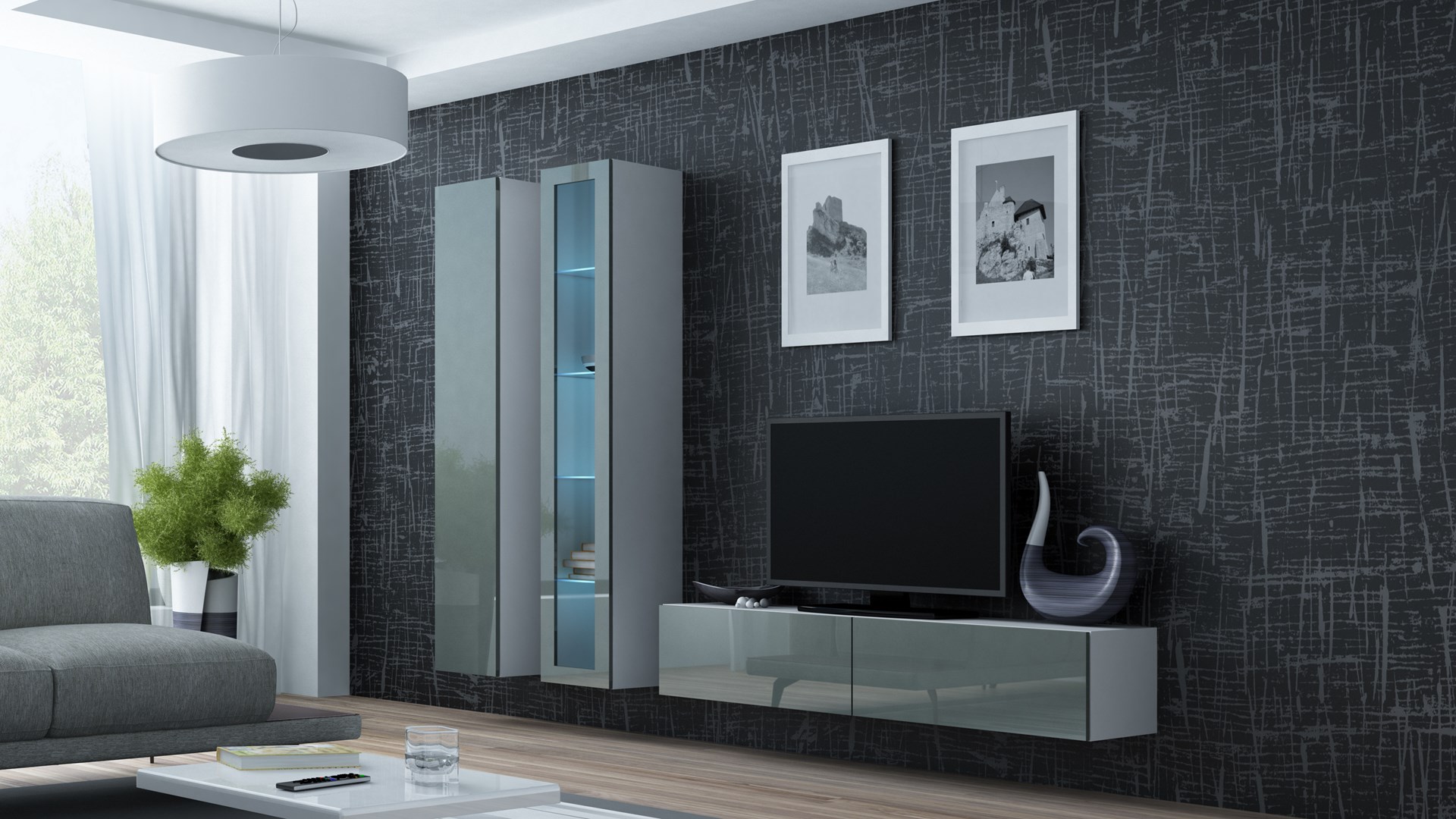 Zdjęcia zestawów przedstawiają przykładową aranżację z innymi meblami z kolekcji. Pozostałe bryły są dostępne w osobnej sprzedaży., Szafka podwieszana, Istnieje możliwość dokupienia oświetlenia szafkowego LED.
