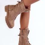 Botki damskie wykonane z eko zamszu i ocieplone kocem obuwniczym. Cholewka za kostkę. Z przodu sznurowanie oraz dodatkowe zapięcie na suwak z boku cholewki. Osadzone na płaskim obcasie i platformie. Na języku biżuteryjna ozdoba. To świetne botki na jesień i zimę! Będą pasować do wielu stylizacji.