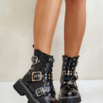 Botki damskie wykonane z eko skóry. Osadzone na płaskim obcasie. Zapinane na zamek. Noski zaokrąglone. Głównym atutem tego modelu są ozdobne paski z klamrami. Ten stylowy model wykorzystasz do wielu jesienno-zimowych stylizacji!