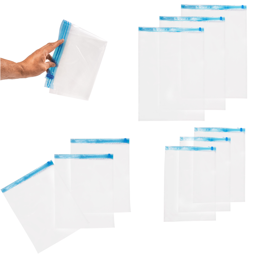 Zestaw dziewięciu worków próżniowych w trzech rozmiarach – 35×50 cm, 40×50 cm, 50x70cm. Idealne do przechowywania ubrań sezonowych czy innych produktów tekstylnych. Worki chronią przechowywane rzeczy przed kurzem, wilgocią oraz owadami.