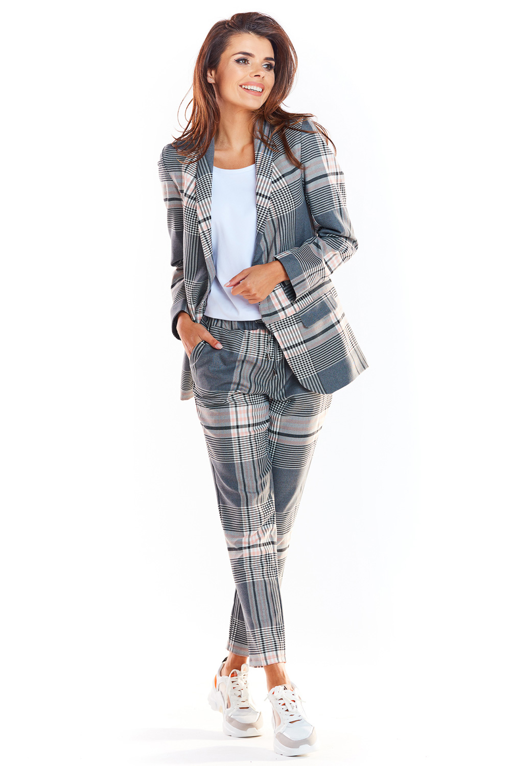Żakiet o luźnym kroju w miejskim stylu. Świetnie wygląda w komplecie ze spodniami A336. Uszyty z tkaniny w ponadczasową kratę.