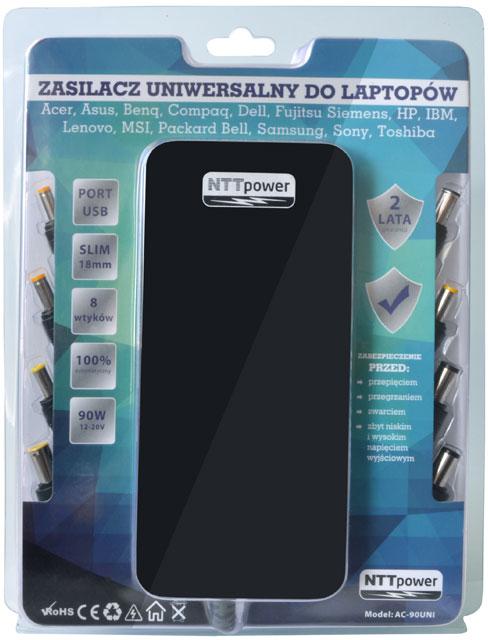 Zasilacz sieciowy NTT POWER AC-90UNI SLIM Automatic USB do notebooków, moc 90W