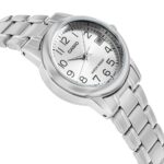 Model CASIO LTP-V002D to zegarek dla kobiet ceniących klasyczną formę i niezawodność. Jego czarna tarcza z wyraźnymi arabskimi cyframi i subtelnymi wskazówkami zapewnia doskonałą czytelność, a kompaktowa, stalowa koperta z bransoletą tworzy elegancki, uniwersalny look – idealny zarówno do biura, jak i na co dzień. Wodoodporność na poziomie codziennego użytkowania i praktyczny datownik czynią go nie tylko pięknym, ale i praktycznym towarzyszem każdego dnia. Wybierz CASIO LTP-V002D i postaw na dyskretną elegancję, która nigdy nie wychodzi z mody.